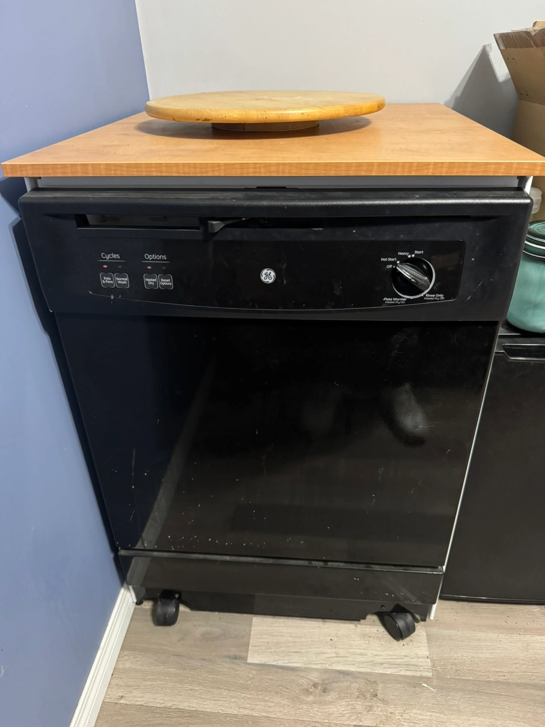 Selling a GE portable dishwasher in black. It's on wheels, making it easy to move around if needed. Perfect for a small kitchen or apartment!