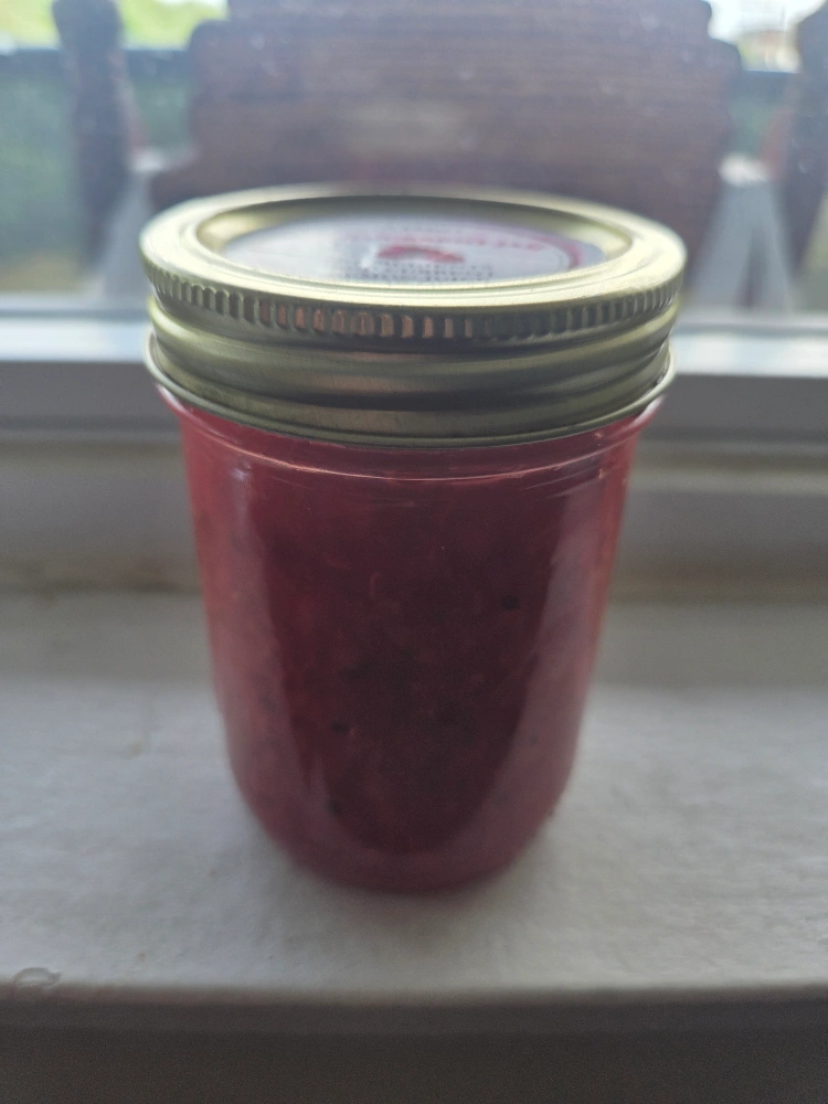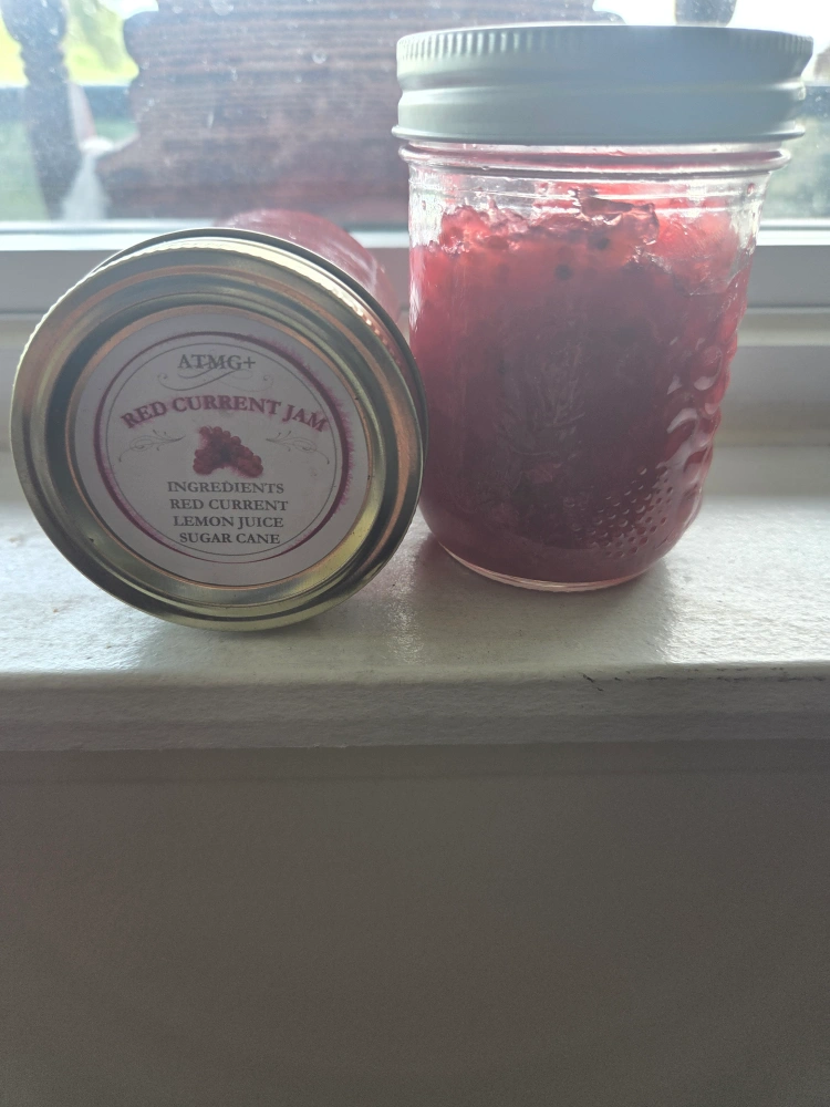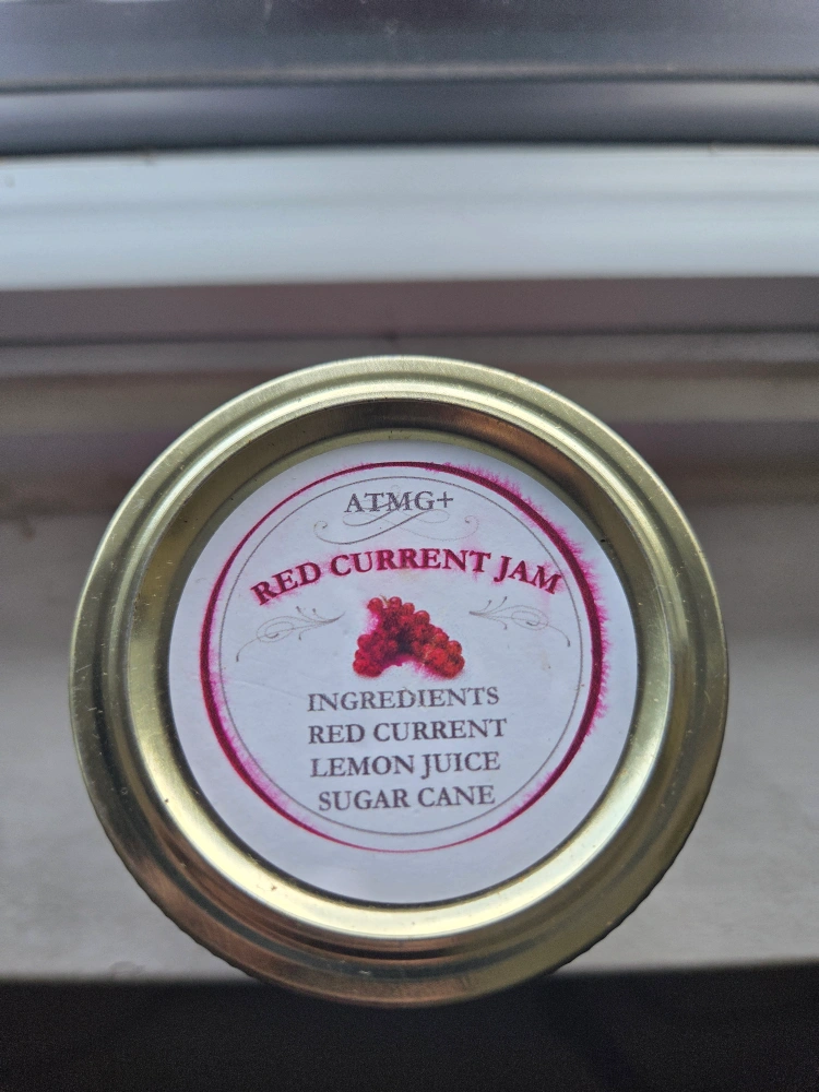 Selling a jar of ATMG+ Red Currant Jam. The ingredients are red currant, lemon juice, and sugar cane $6/Jar Pick Up Only @Keele & Sheppard Farm
