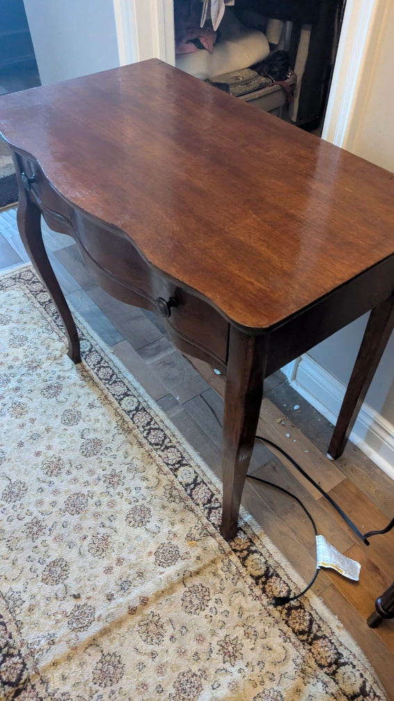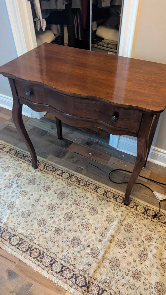 Selling a lovely antique side table. It features a drawer with a unique patterned lining. The wood has a beautiful, rich finish. It would make a great addition to any room!