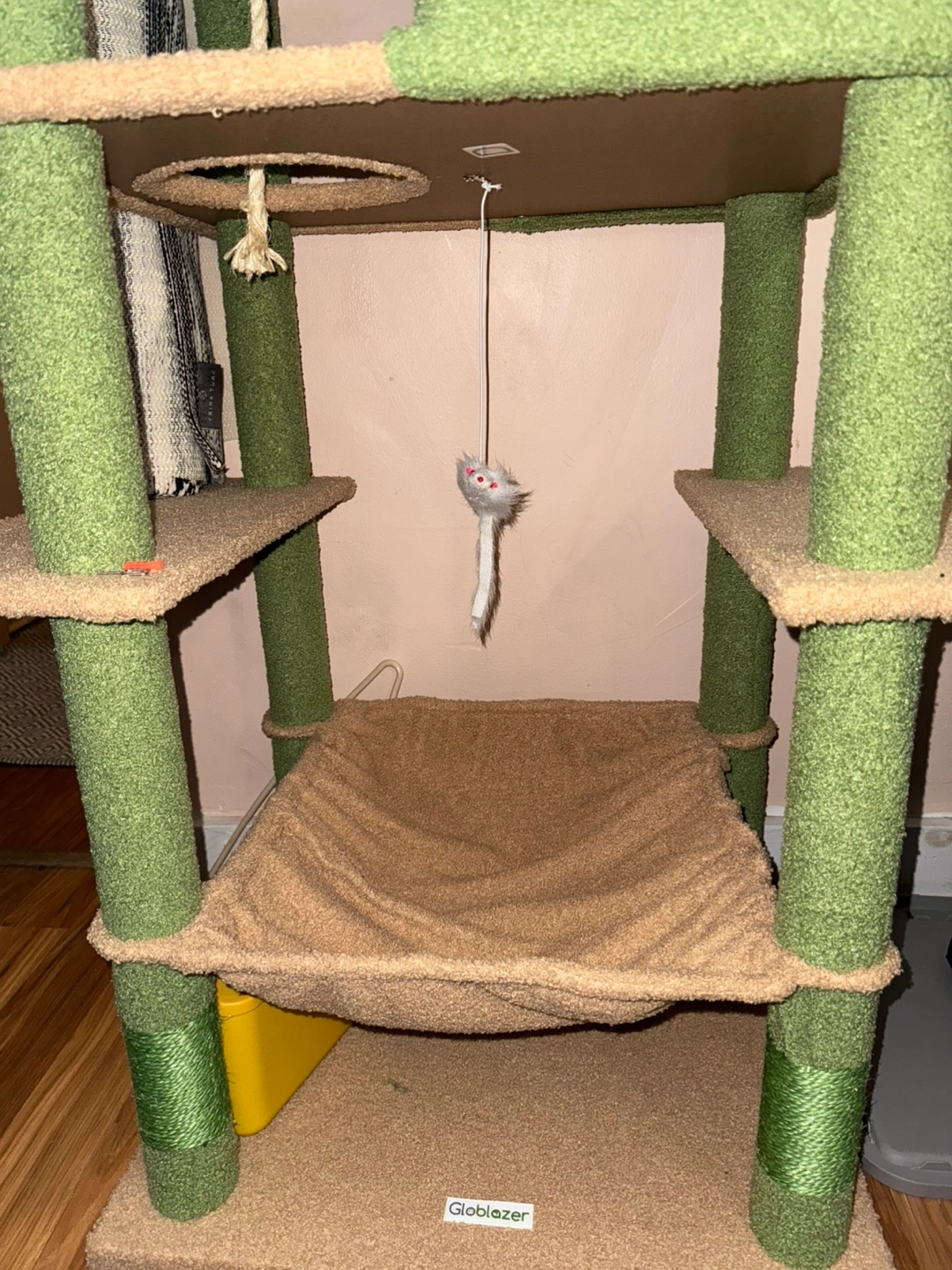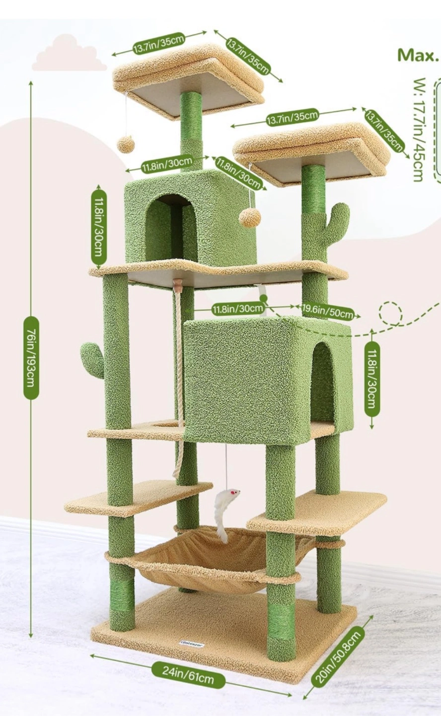 Multi-level cat tree with hammock and scratching posts! It has a green and beige color scheme. The cat tree features several platforms, a hammock, and a condo for your cat to explore and relax. Dimensions are approximately 76 inches (193 cm) in height, 24 inches (61 cm) in width, and 20 inches (50.8 cm) in depth.