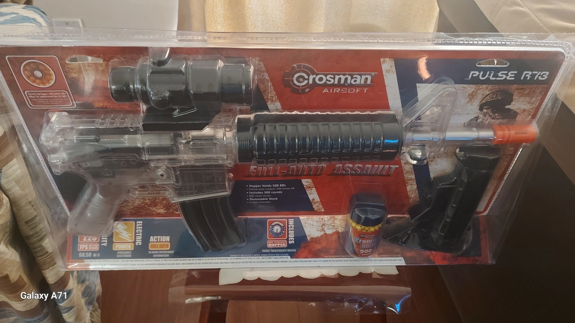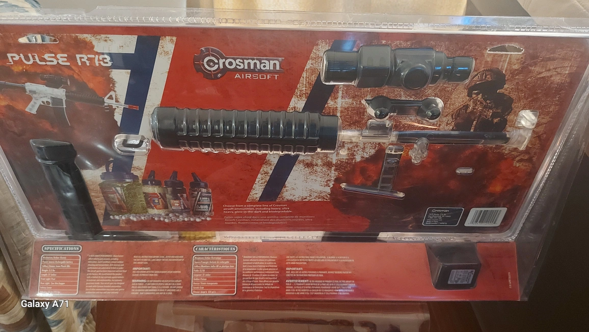 Selling a brand new Crosman Pulse R73 full-auto assault airsoft rifle! It's still in its original packaging. This airsoft rifle has a hopper that holds 500 BBs and is electric powered. Ready for some action?