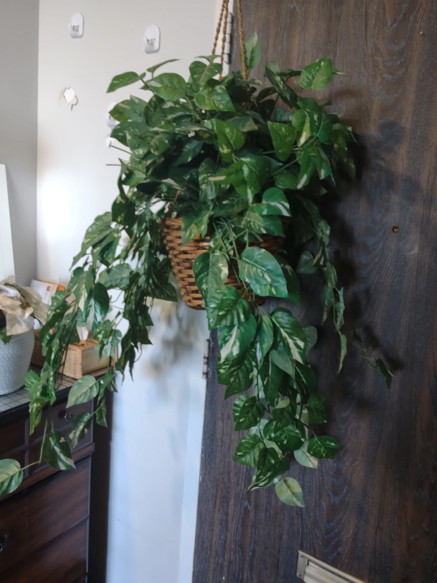 I'm selling a hanging artificial pothos plant! It comes in a cute woven basket. This plant is perfect for adding a touch of greenery to any room without the hassle of maintenance.