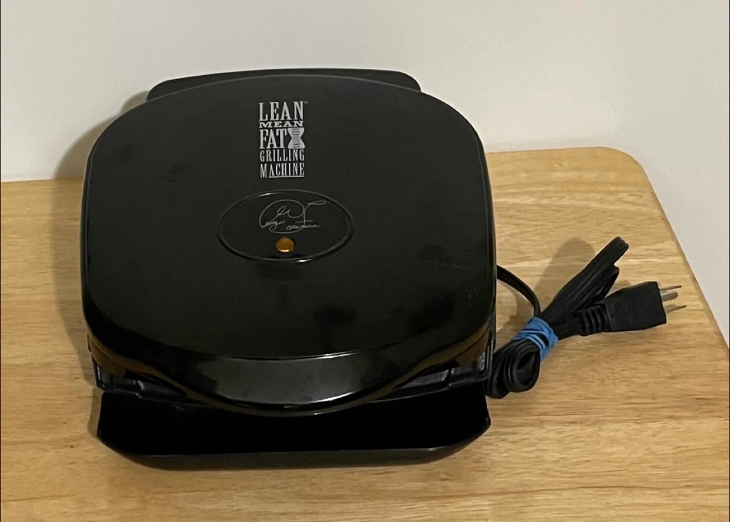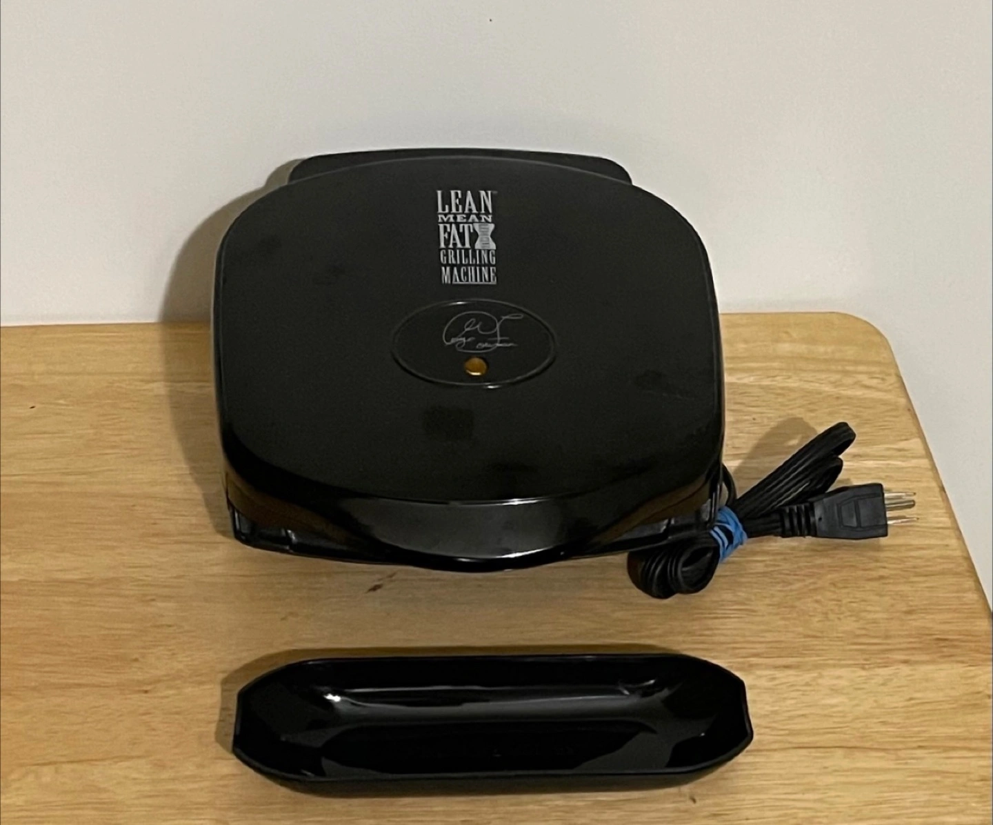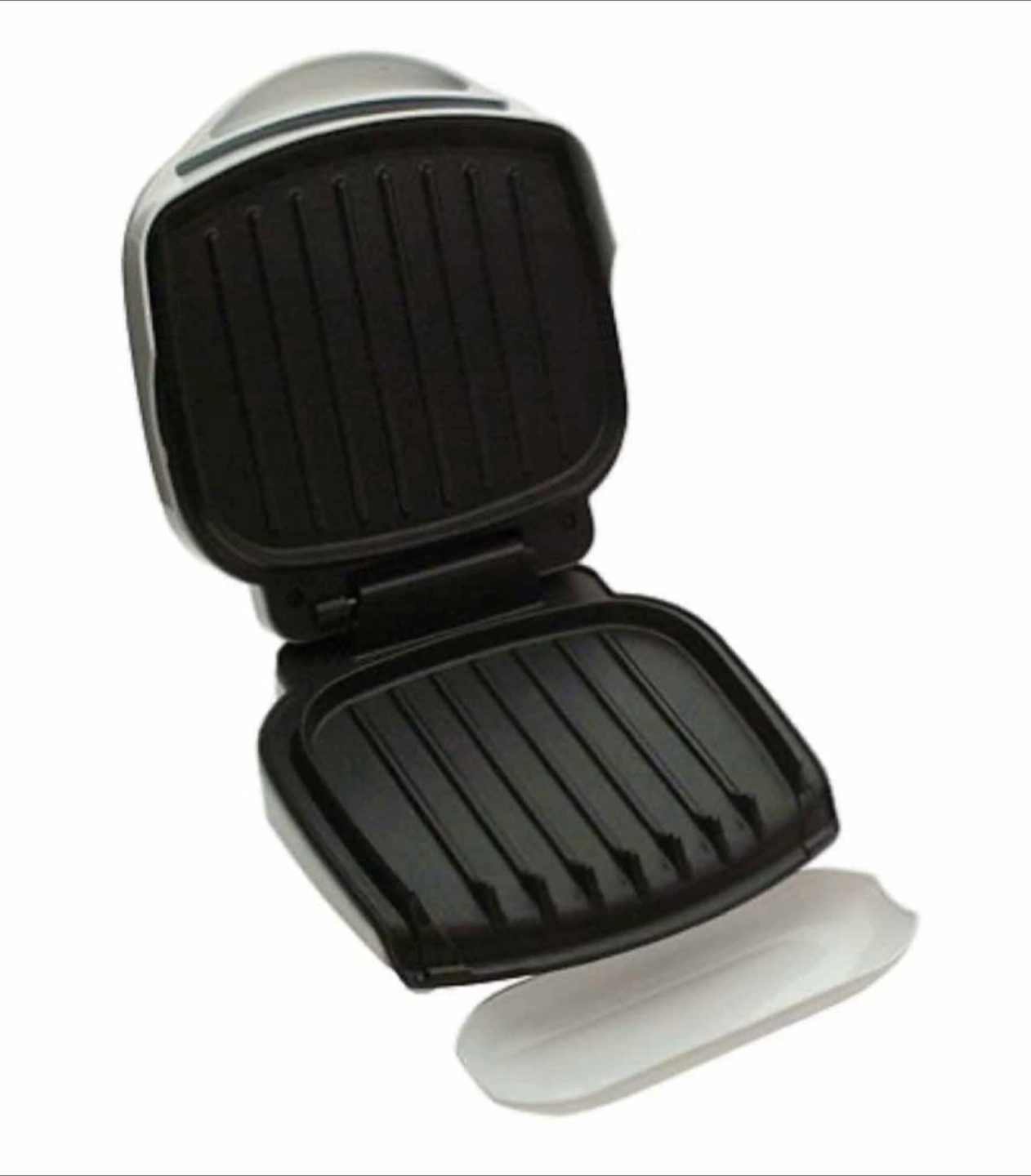 New George Foreman black electric lean meat fat grilling machine. Includes a small, black drip tray. Compact design, ideal for smaller kitchens or apartments. Great for lean meats and healthy indoor cooking.