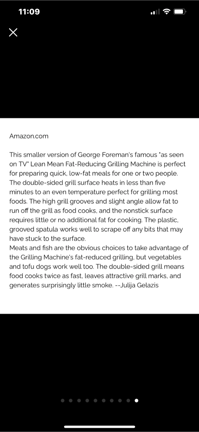 * Food tastes better and is healthier when prepared on the patented George Foreman Lean Mean Fat Reducing Grilling Machine. Sloped grill surface drains excess liquids away from food resulting in a healthier meal. Floating hinge lets you cook thin to thick cuts of meat. Cleanup is fast and easy with durable, double-coated nonstick grilling plates.