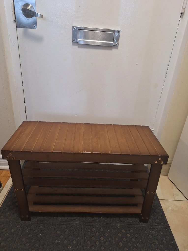 Selling a wooden shoe rack bench! It's perfect for entryways or mudrooms to keep your shoes organized. The bench provides a convenient place to sit while putting on or taking off your shoes. It's in good condition and ready for a new home!