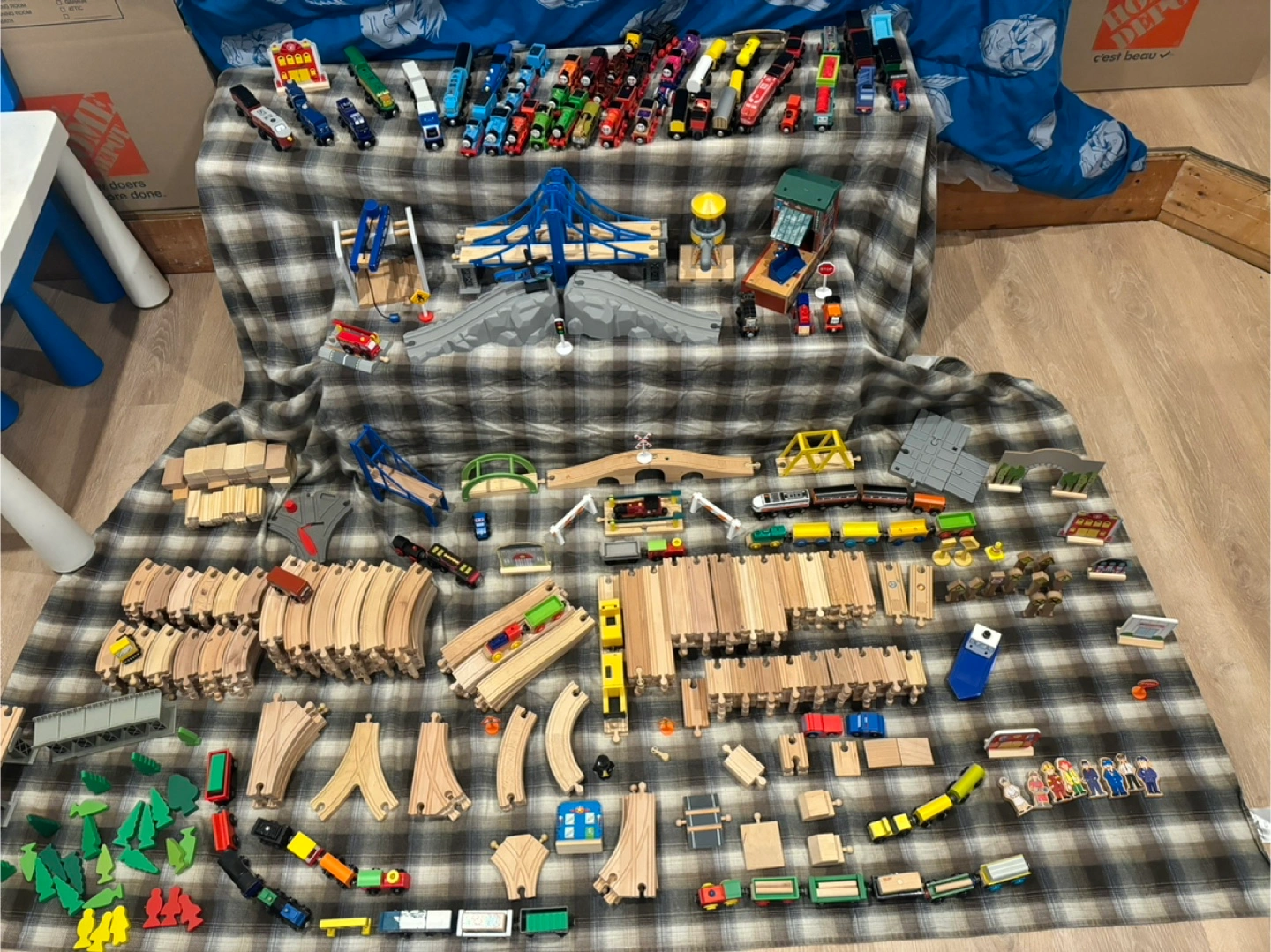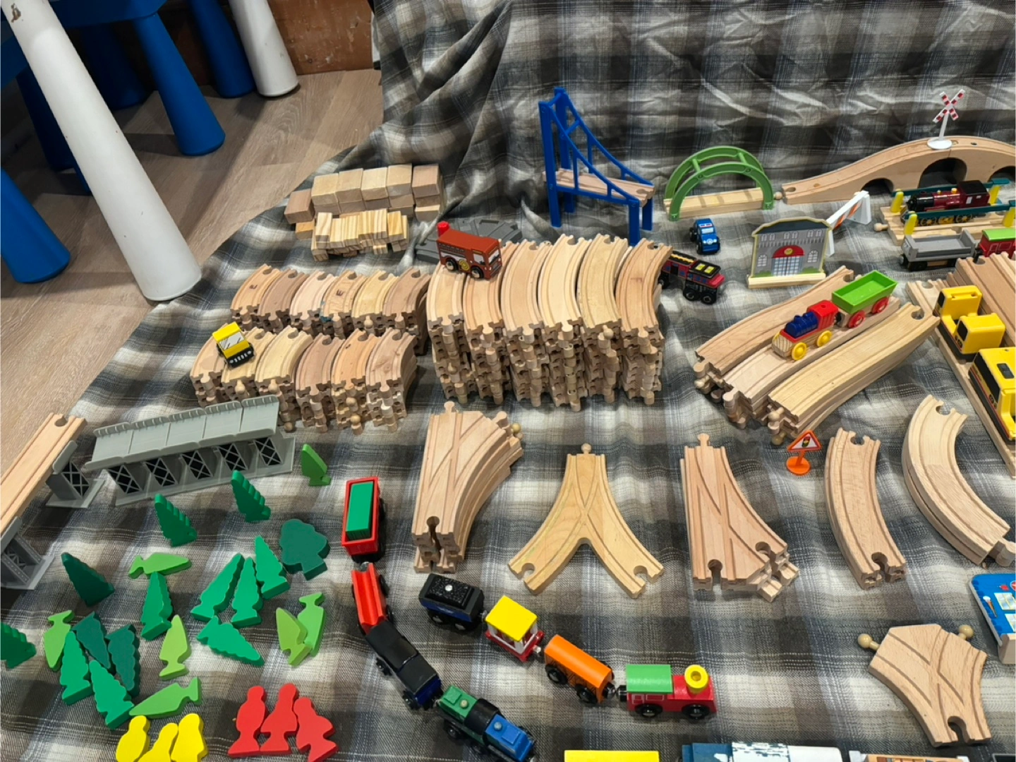 Huge wooden train set with lots of tracks, trains, figures, and accessories! Hours of fun for kids who love trains and building things. Over 400 pieces of track plus so much more