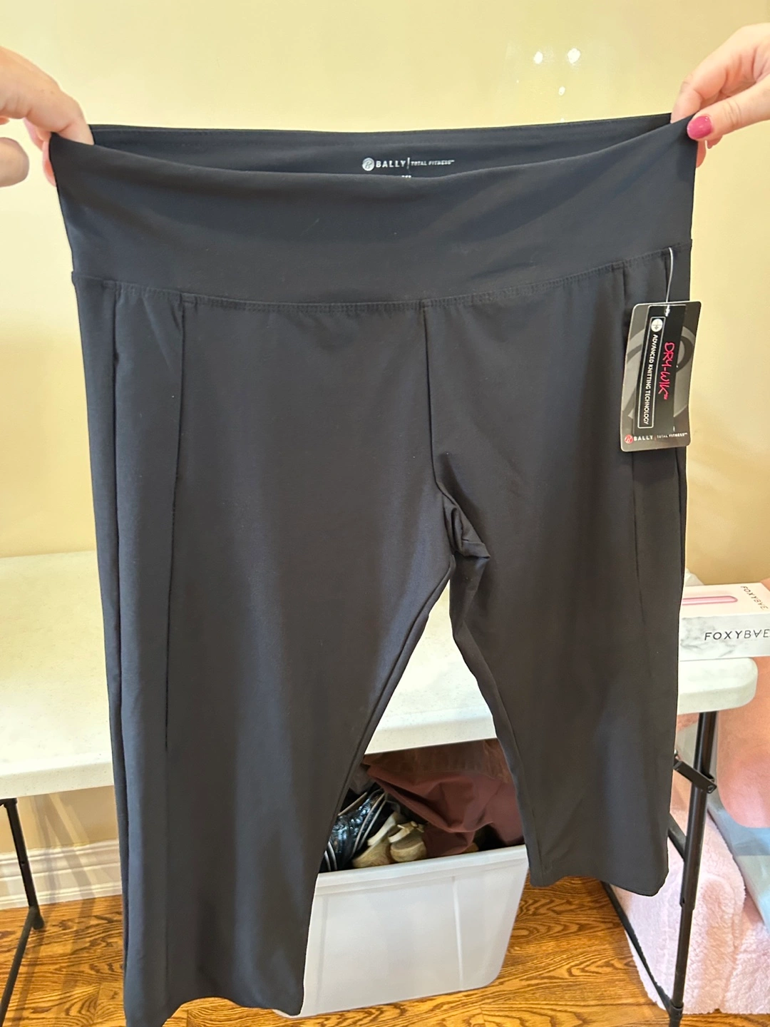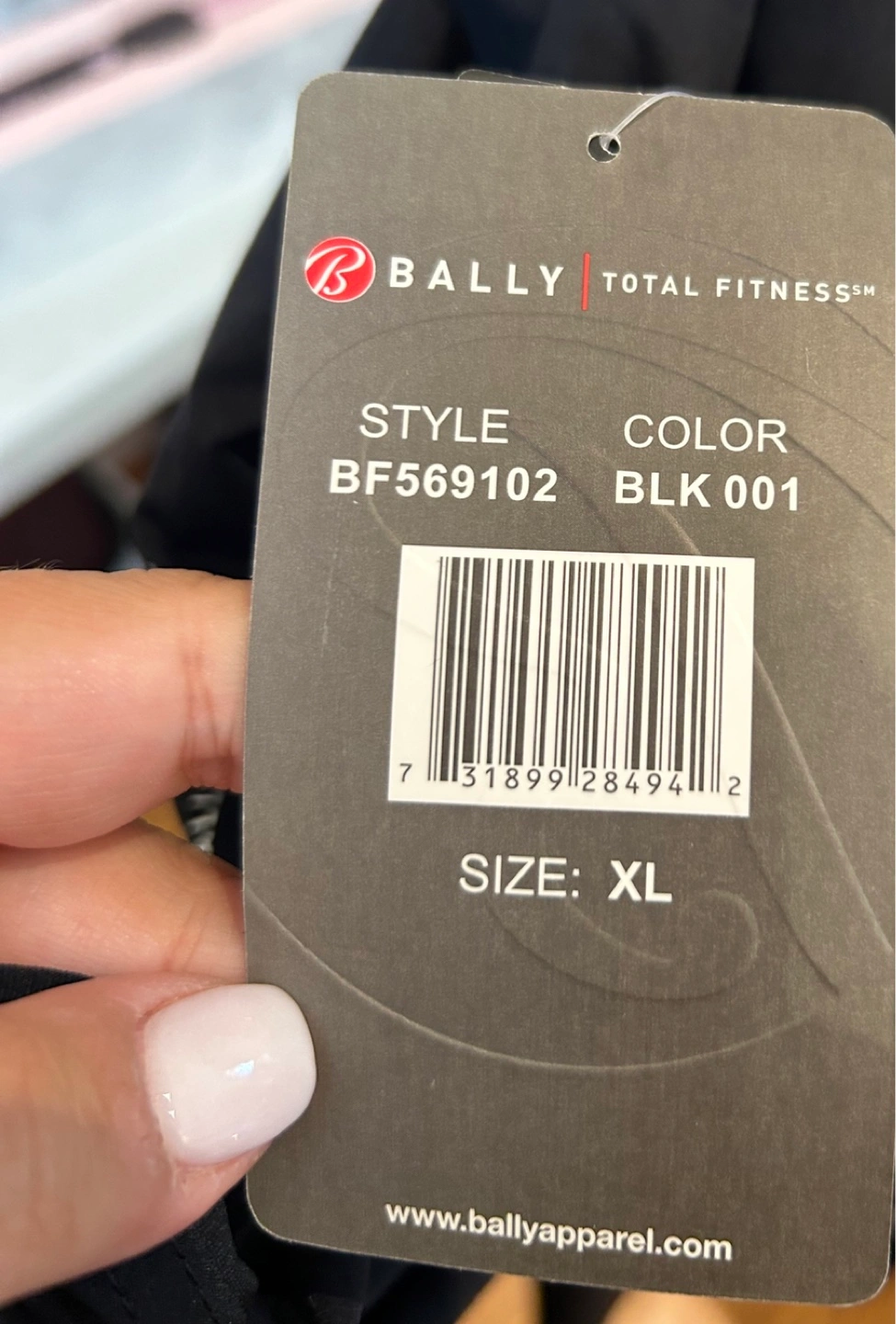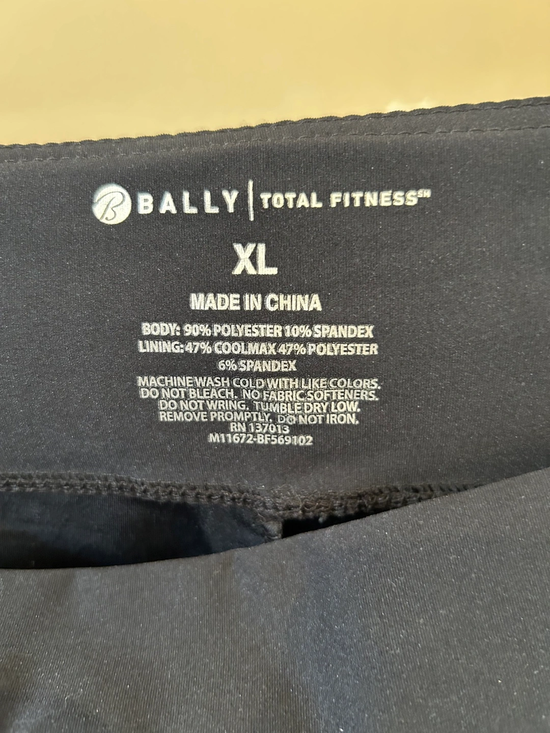 Selling a pair of Bally Total Fitness capri leggings in black, size XL. The style number is BF569102 and the colour code is BLK 001. The body is made of 90% polyester and 10% spandex, with the lining being 47% Coolmax polyester and 6% spandex