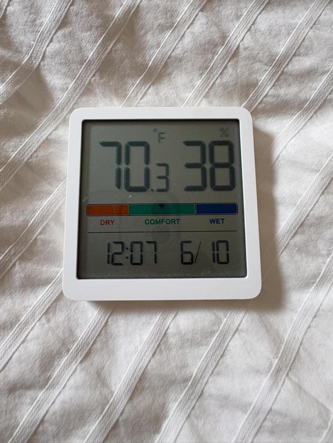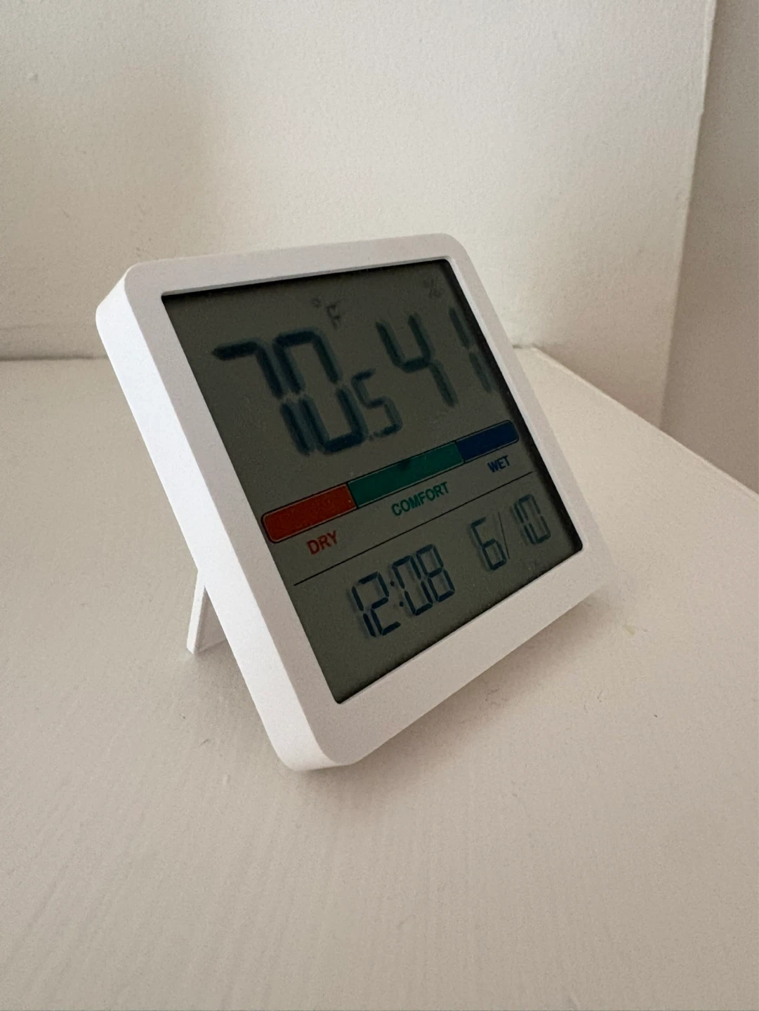 This digital thermometer and hygrometer displays temperature in Fahrenheit and humidity percentage. It also indicates the comfort level of the environment. Includes clock function showing time and date.