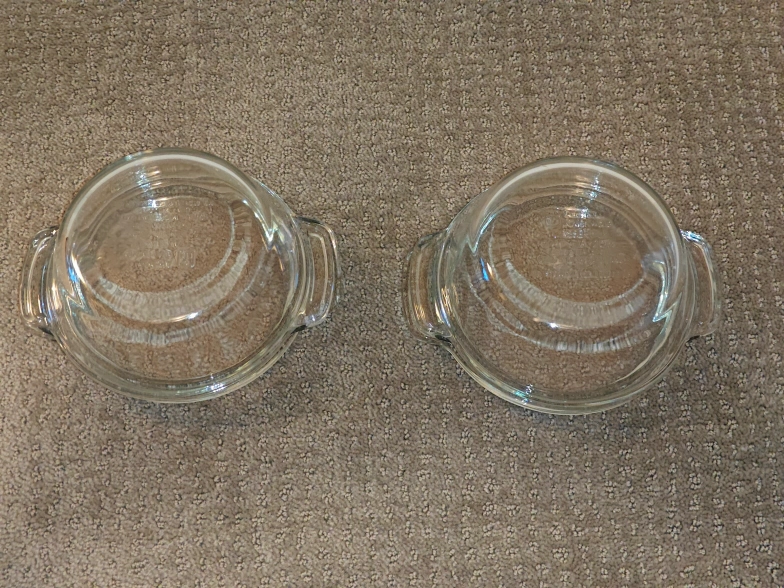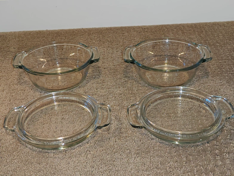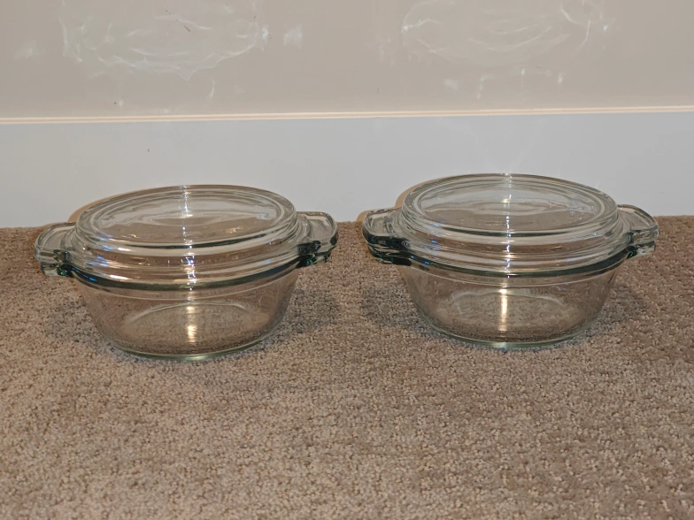 I am selling a matching set of two (2) Anchor Ovenware 20 oz glass casserole dishes with Glass Lids in used, good condition. Some signs of minor scratches along with the notes above. These are high-quality, thick glass pieces made in the USA—perfect for individual pot pies, side dishes, or reheating leftover. The oversized capacities are perfect for cooking and re-heating items with oversized easy-to-grip handles. For meal prep, storage leftovers, and all food storage needs.