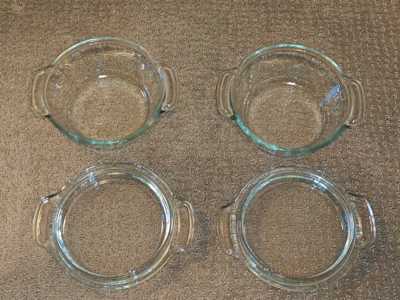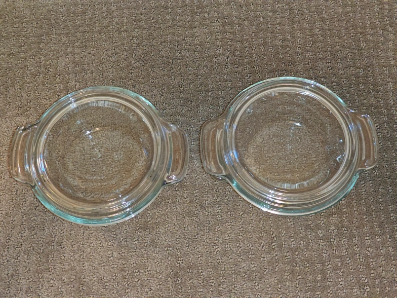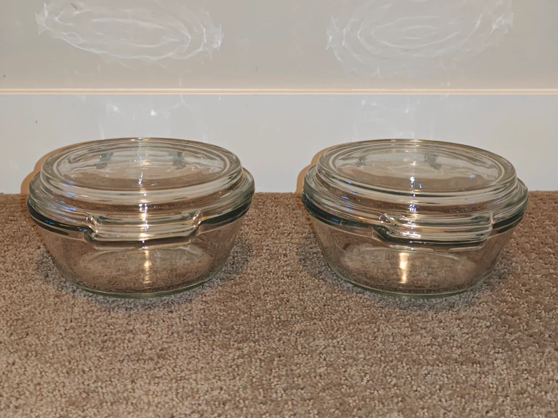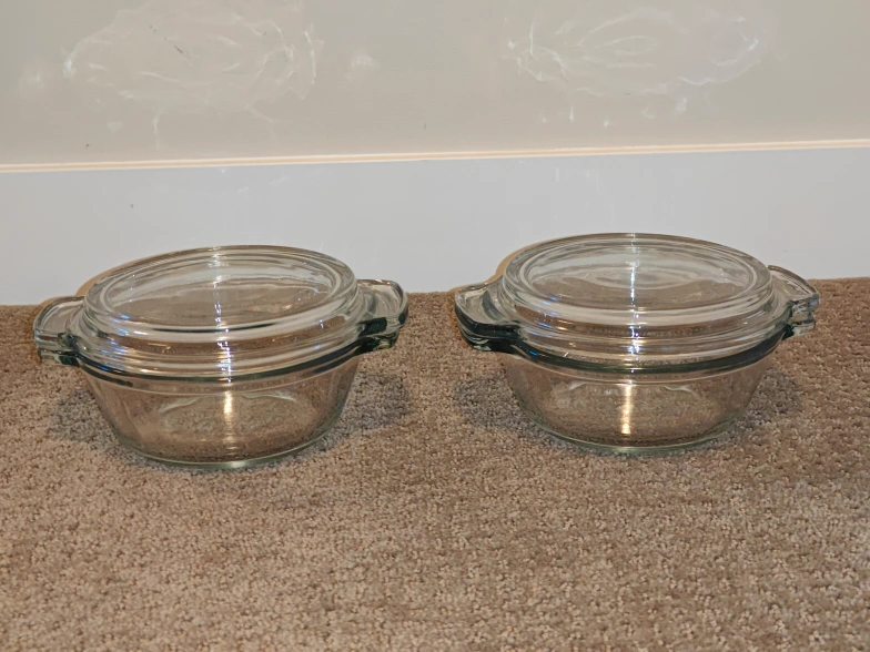 I am selling a matching set of two (2) Anchor Ovenware 20 oz glass casserole dishes with Glass Lids in used, good condition. Some signs of minor scratches along with the notes above. These are high-quality, thick glass pieces made in the USA—perfect for individual pot pies, side dishes, or reheating leftover. The oversized capacities are perfect for cooking and re-heating items with oversized easy-to-grip handles. For meal prep, storage leftovers, and all food storage needs.