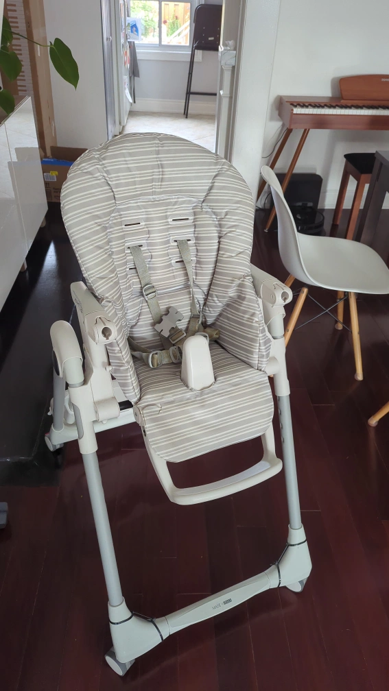 Selling a Peg Perego Prima Pappa Zero3 high chair. It's in used condition but still really good and ready for a new home! The chair is white with a striped grey and white cushion.