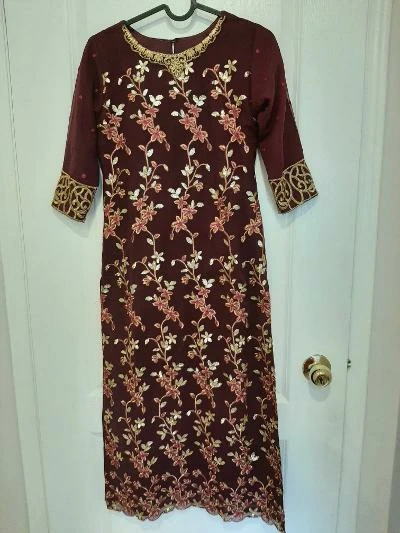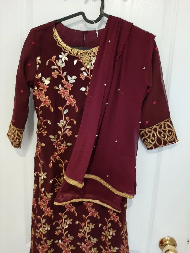New - Very pretty, girls party wear salwar. Has elaborate gold thread and sequins work on kurta and dupatta. Salwar is silky material.