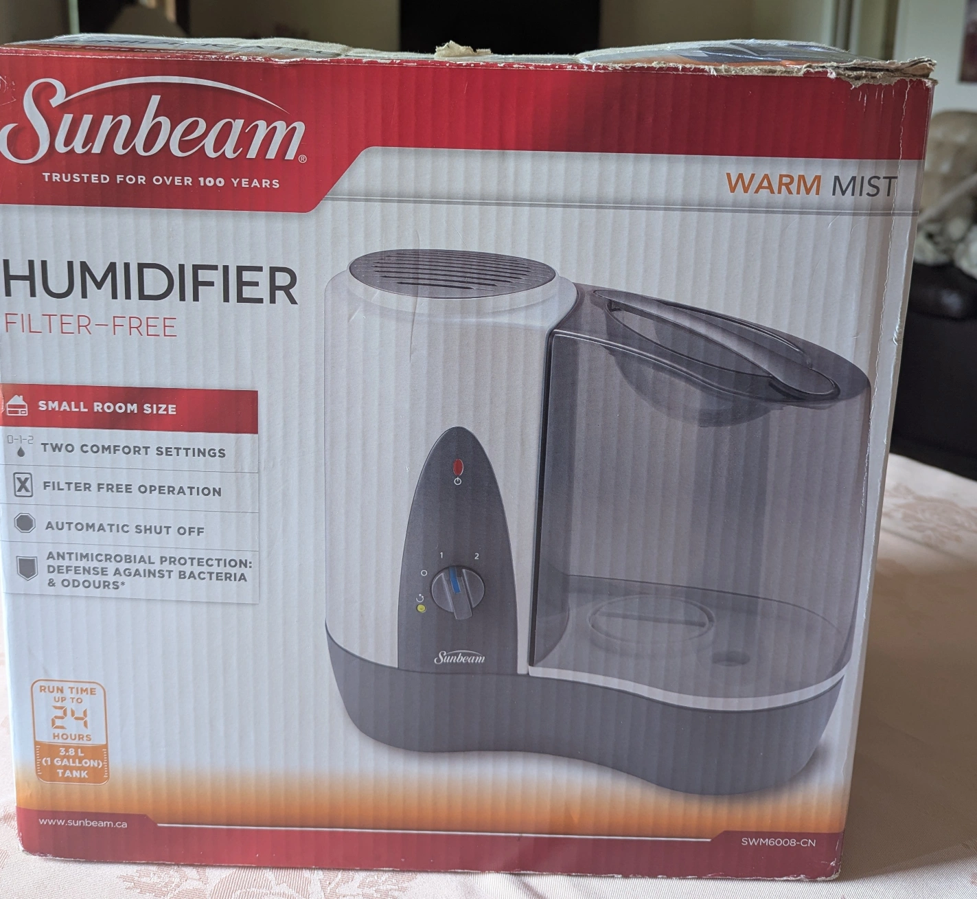 Selling a Sunbeam Warm Mist Humidifier. It's filter-free and designed for small room sizes. It features two comfort settings and automatic shut-off. It also offers antimicrobial protection against bacteria and odours. The tank has a 3.8 L (1 gallon) capacity and can run for up to 24 hours. Comes with the original box!