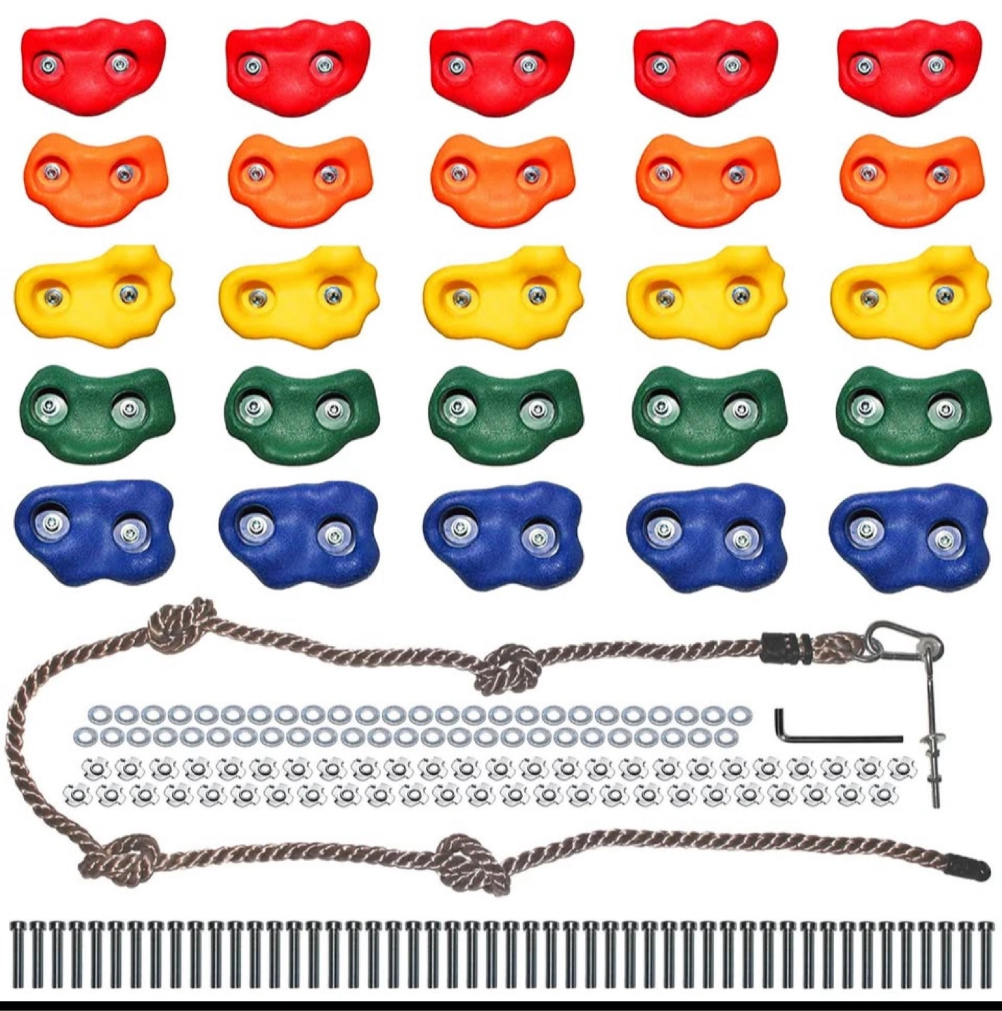 Jungle gym Kingdom,These climbing holds are great for kids who love to climb! They're made of durable plastic and come in a variety of colours. The set also includes a soft and smooth braided rope. Perfect for residential swingsets, obstacle courses, jungle gyms, and play sets