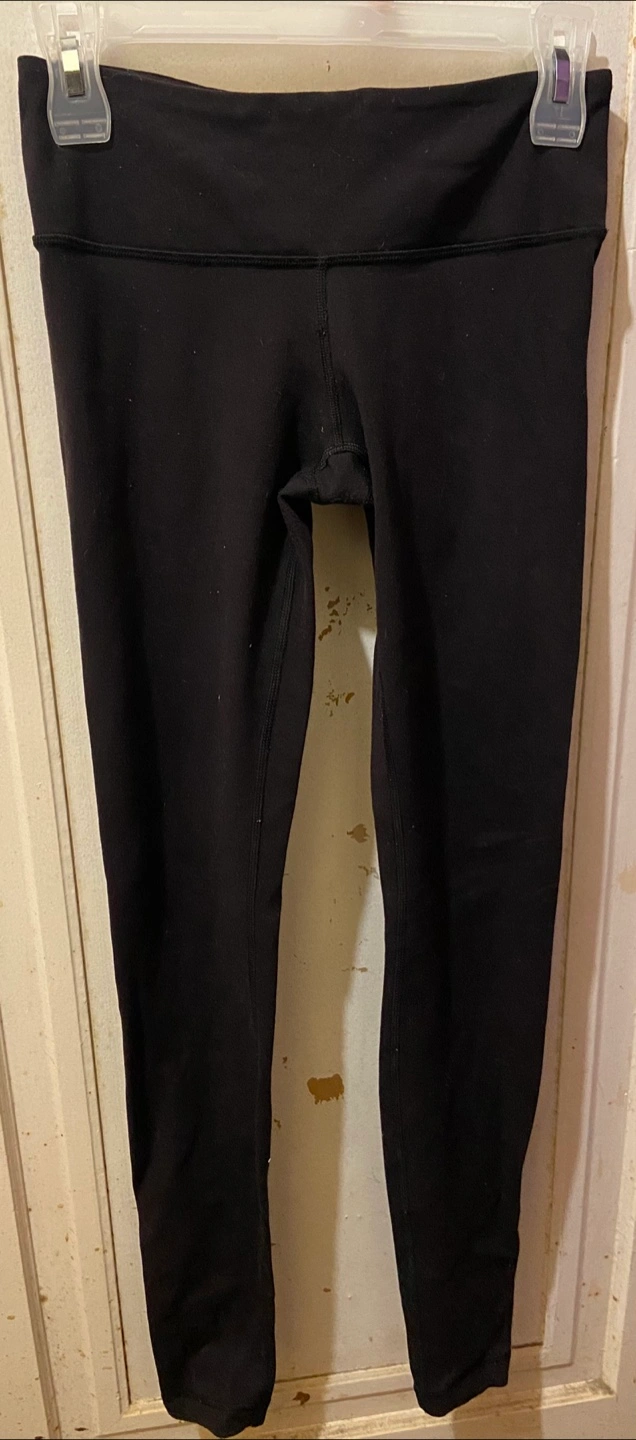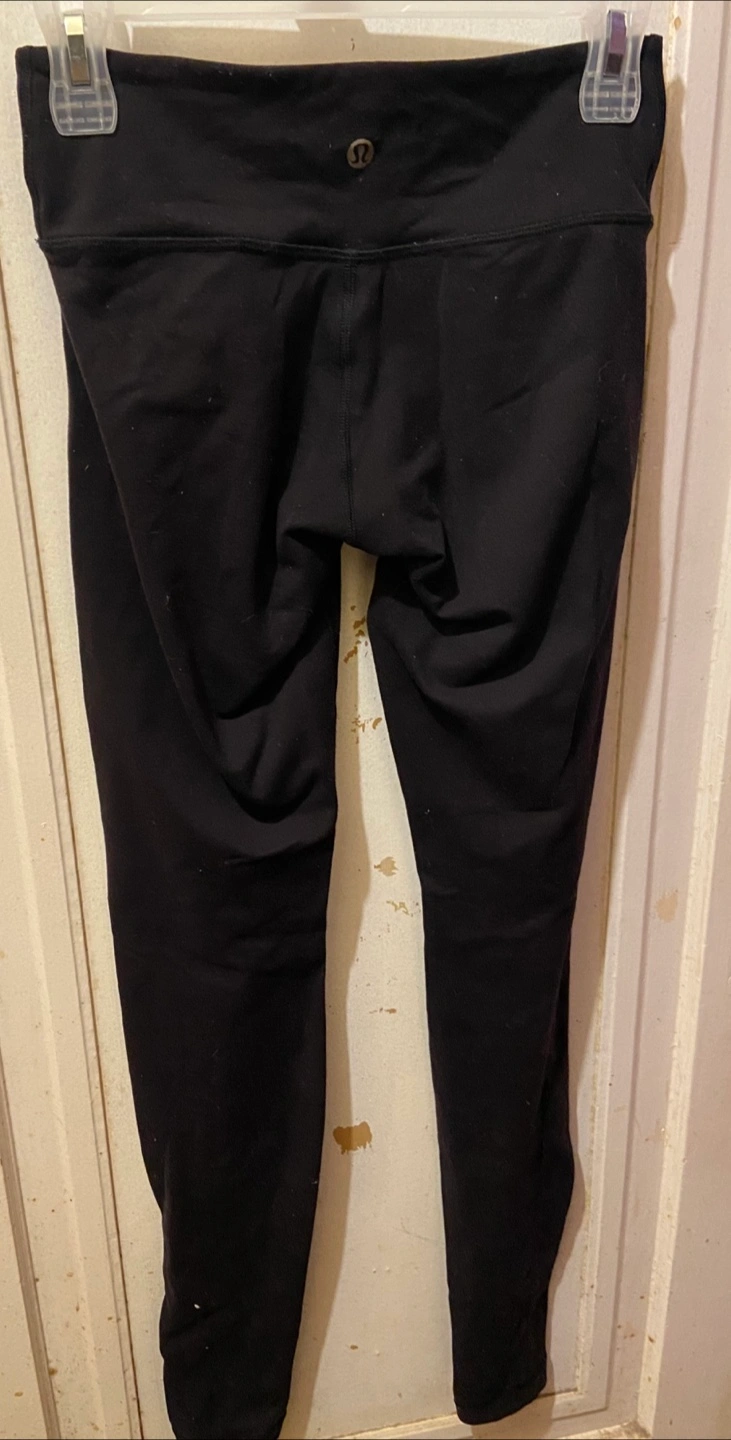 These are black size 4 Lululemon leggings, perfect for yoga or everyday wear. Being that these leggings are used, in good condition.