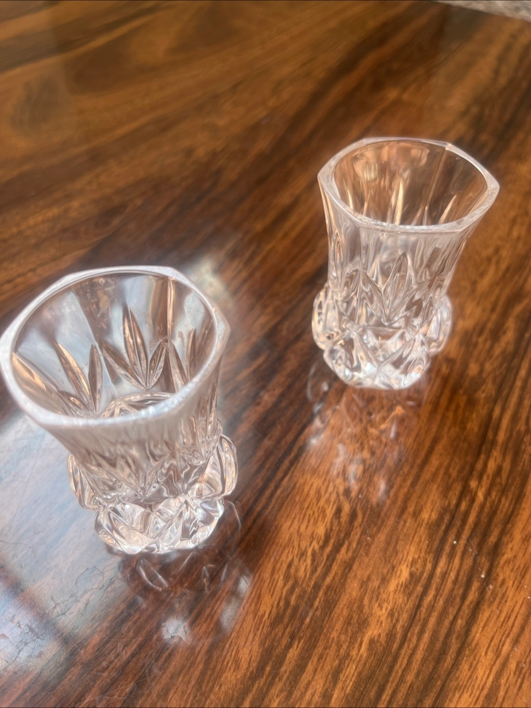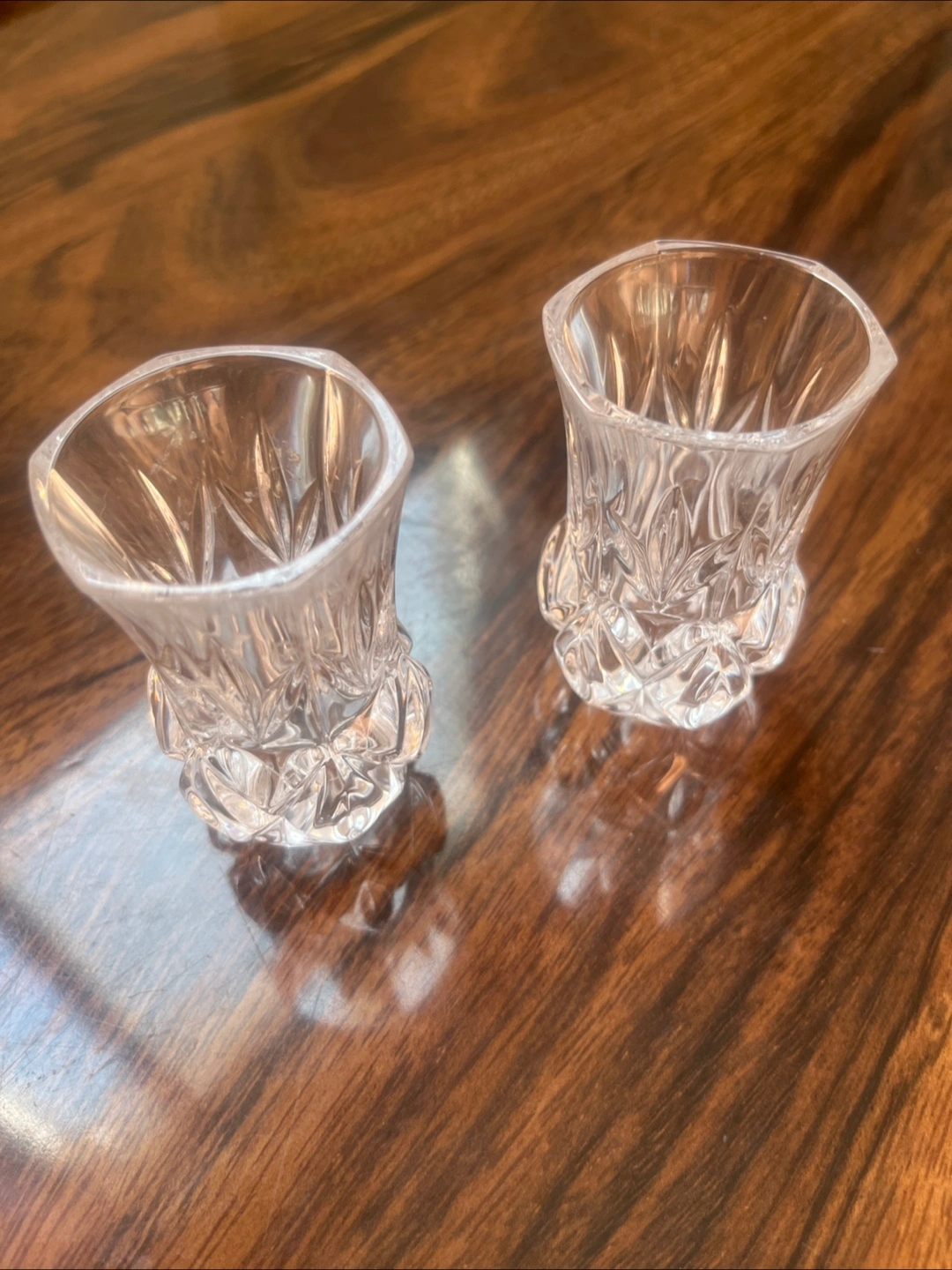 369Selling a pair of clear crystal shot glasses. They feature a beautiful cut crystal design. Perfect for adding a touch of elegance to your home bar or special occasions!