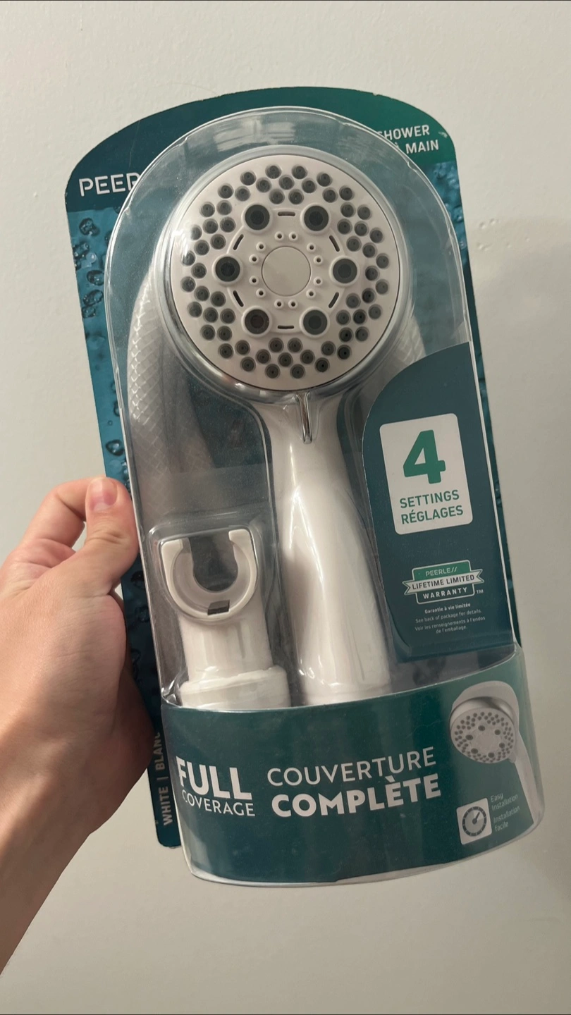 Selling a brand new Peerless Full Coverage Hand Shower in white! It features 4 spray settings, including aerated spray, full body spray and massage spray. It's designed for easy installation with no tools needed. The Touch-Clean spray holes make for easy removal of buildup. It also includes a lifetime limited warranty!