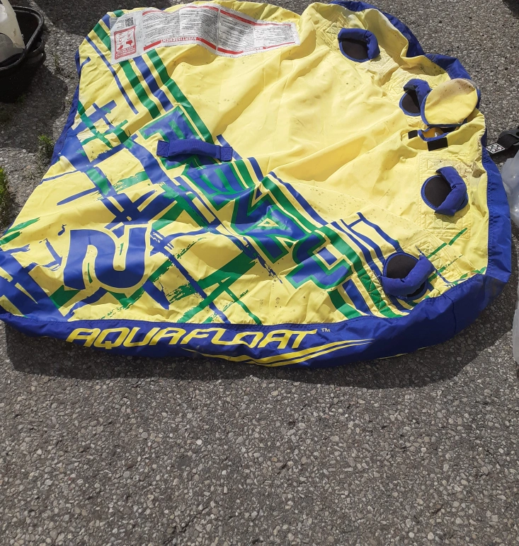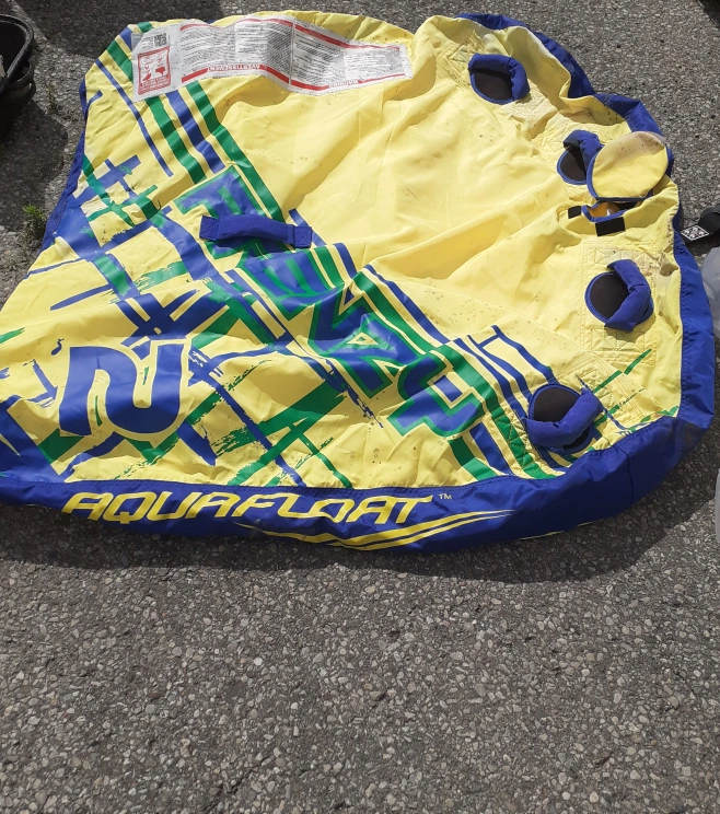 Selling an AquaFloat river tube! It's yellow and blue, perfect for some fun on the water. It has multiple handles and is ready for a new adventure