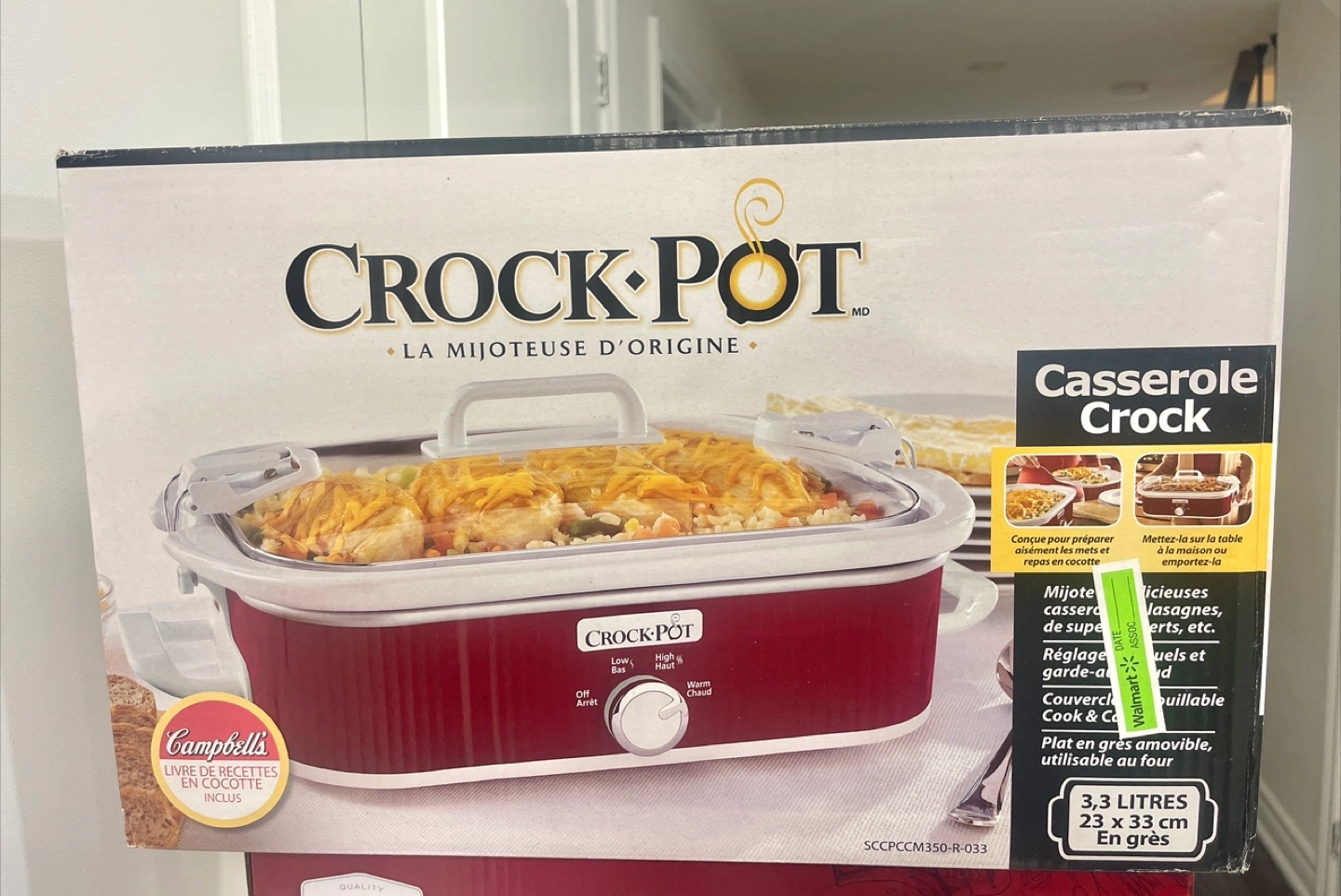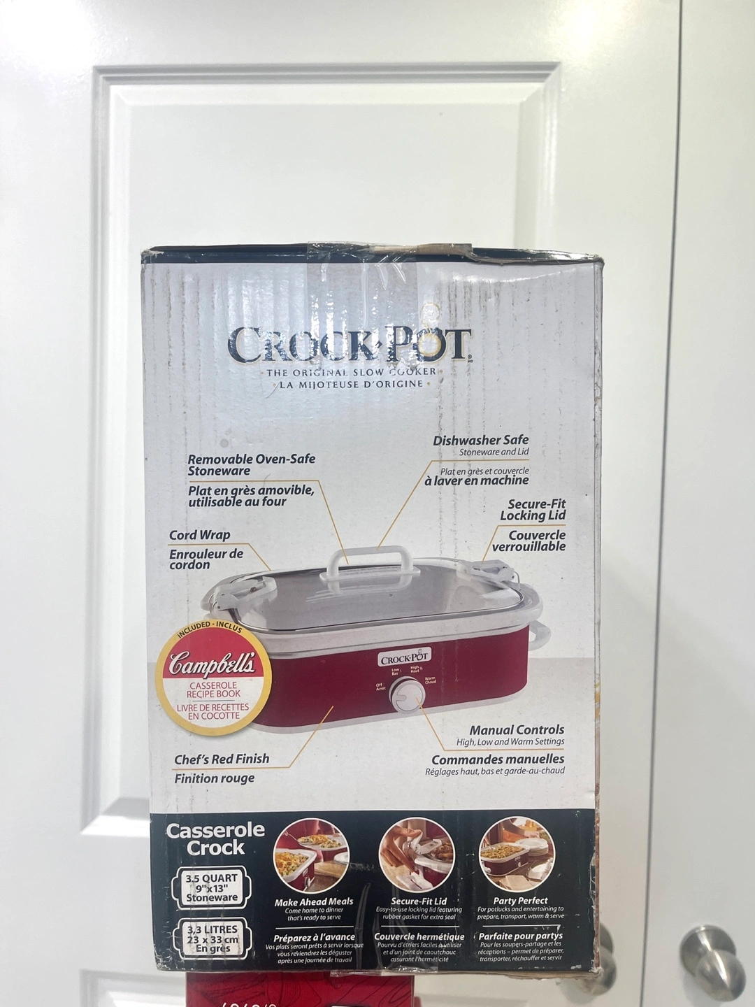 Selling a brand new Crock-Pot Casserole Crock slow cooker, still in its original box! It's a 3.3 litres (23 x 33 cm) stoneware dish that's oven-safe and easy to clean in the dishwasher. The lid locks securely, making it perfect for parties or potlucks. It also features manual controls with low, high, and warm settings. The colour is a lovely 'Chef's Red Finish' too!