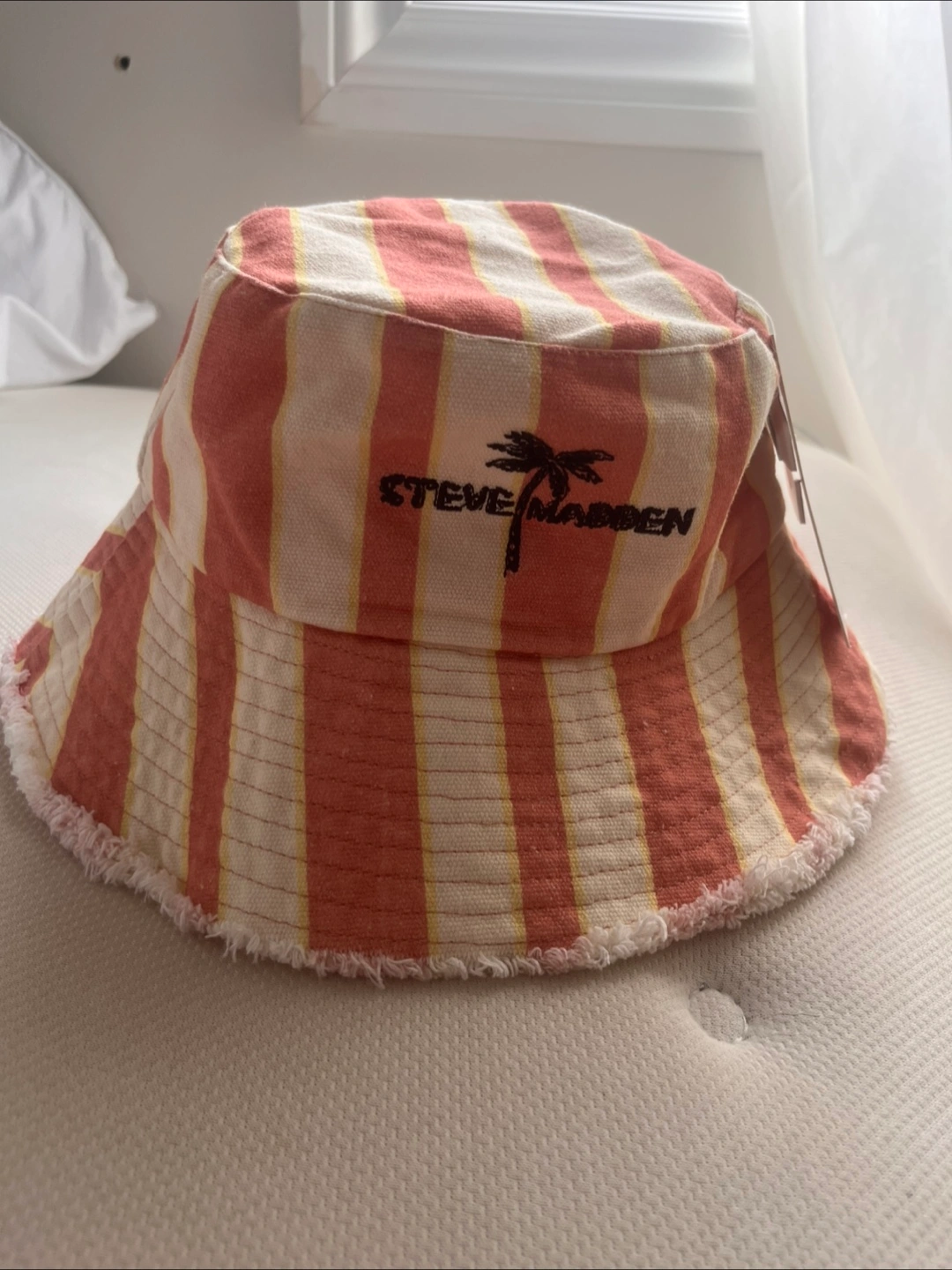 Stylish striped bucket hat from Steve Madden! It's new, never worn was given as a gift. The hat features a fun striped pattern in shades of pink,yellow and cream, with the Steve Madden logo embroidered on the front. It's a one-size-fits-most hat 100% cotton. Lining: 97% polyester, 3% other fiber.