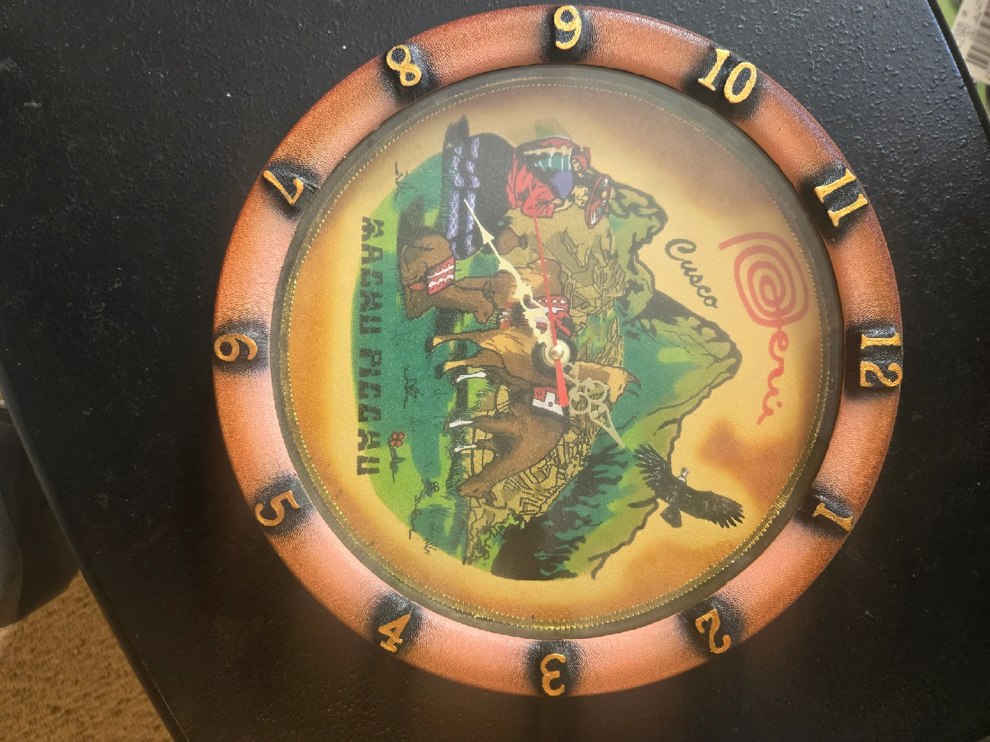 Selling a unique wall clock featuring a Peruvian Cusco design. It has numbers around the edge and a colourful scene in the centre, including Machu Picchu. A great piece for adding some cultural flair to your home!