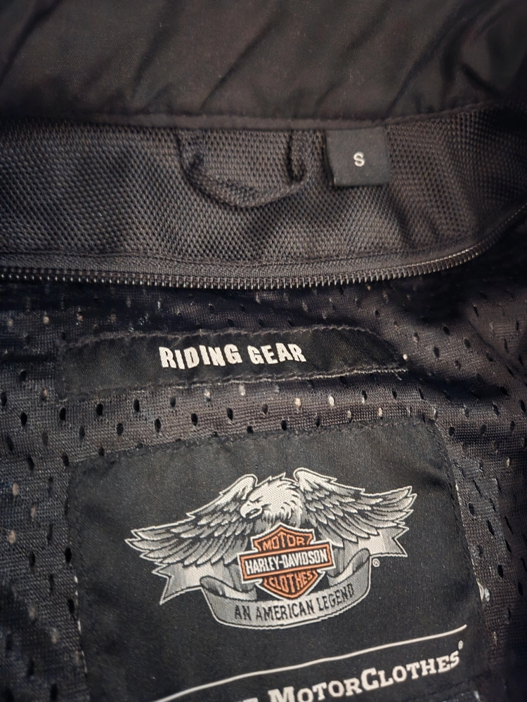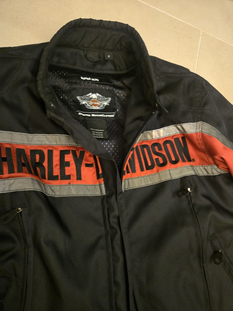Almost new, Genuine Harley, loose fit, men's size S, almost fits my regular Medium; Snug with cool weather liner; the best best best HD jacket design ever, simple, no complicated buckles, lightweight, optimal ventilation and protective reflective wide strips fromt and back; iconic 2-tone Orange & Black perfectly balanced! too bad its too tight for me lately! D30 nano tech. gel elbow and shoulder protection pads; nighttime reflective strips; bold logo; zippered multiple airflow vents, front and back. Best venting! Many exterior and interior zippered pockets; Cash only, Price firm.