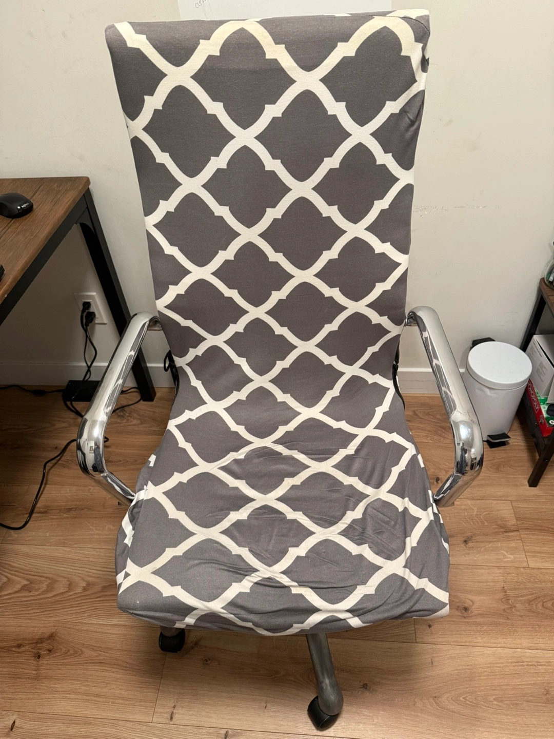 Spruce up your office chair with this stylish cover! It features a grey and white pattern that can easily refresh the look of your workspace. It's in great condition and ready to use