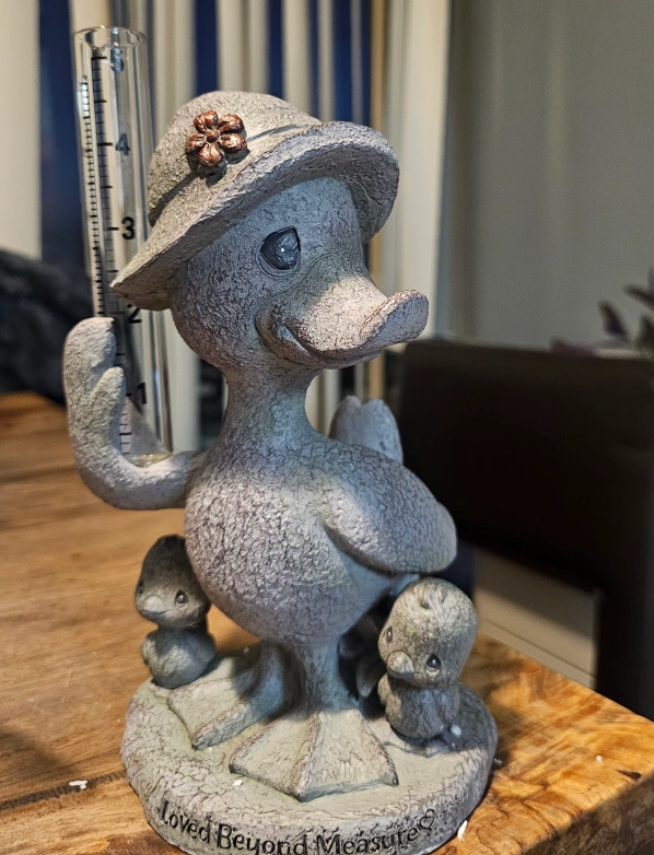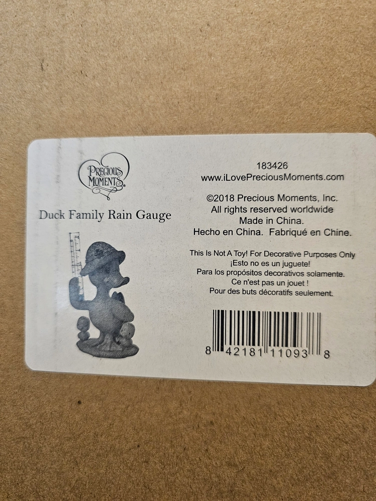 Selling a Precious Moments Duck Family Rain Gauge! It's in great condition and is perfect for adding a touch of whimsy to your garden. It's a decorative piece that also functions as a rain gauge, so it's both cute and practical