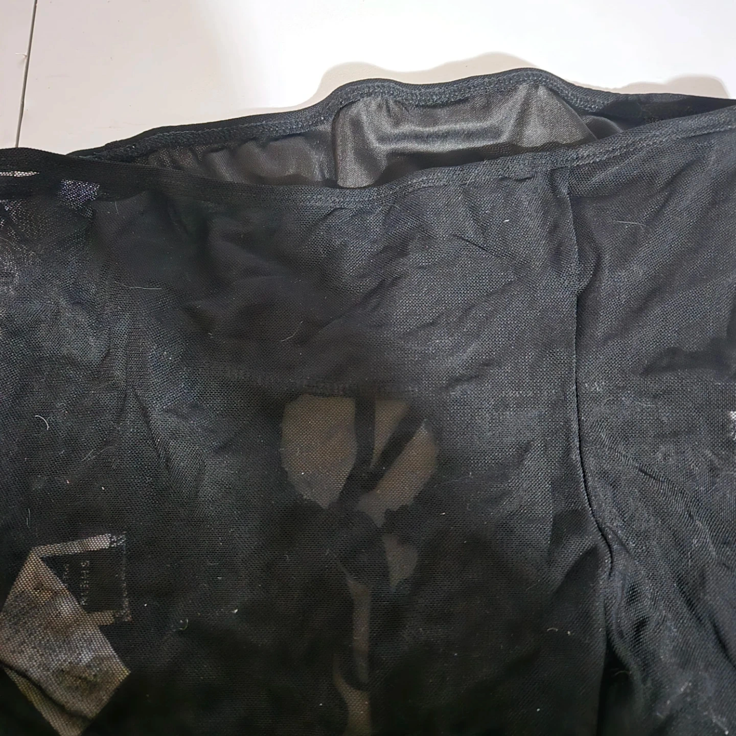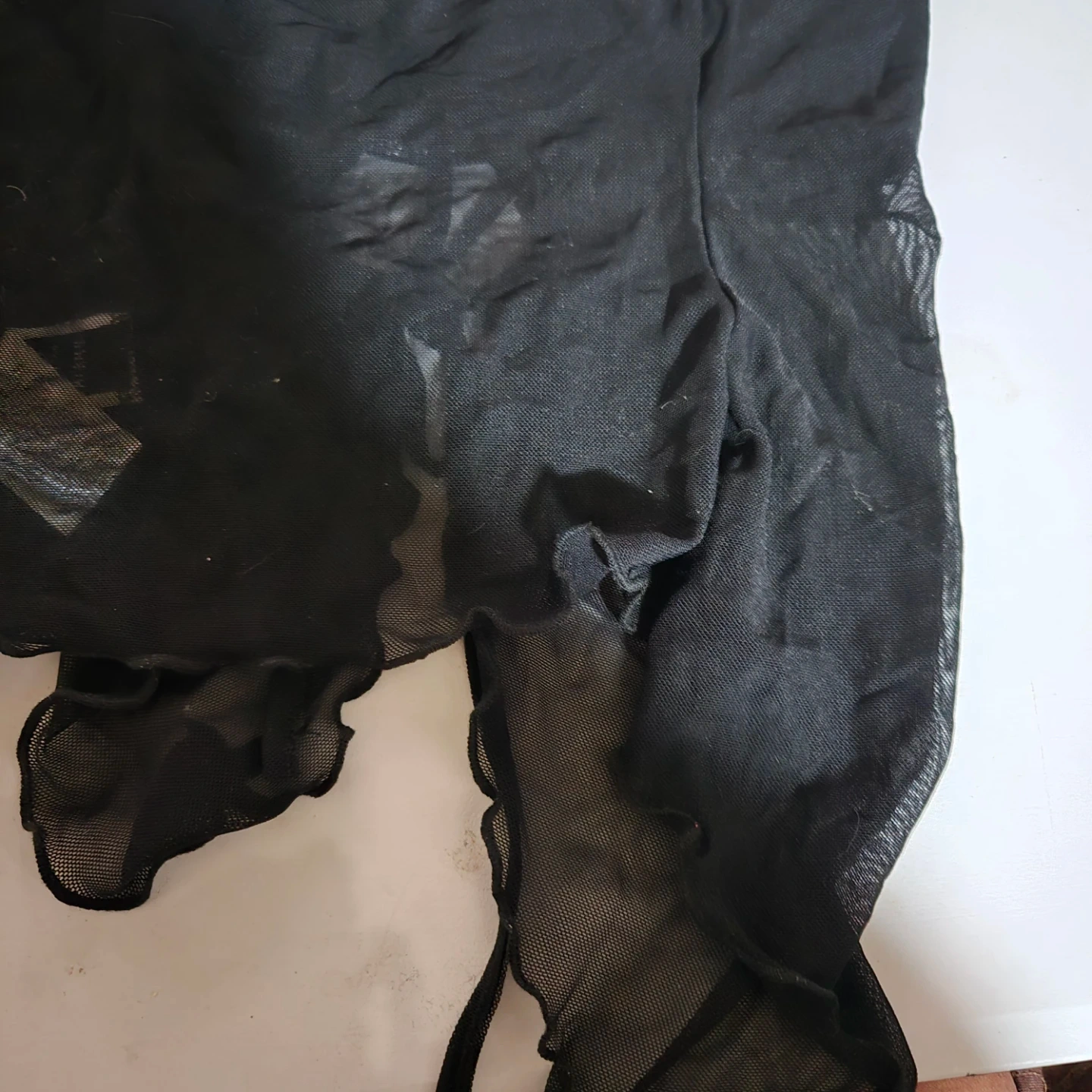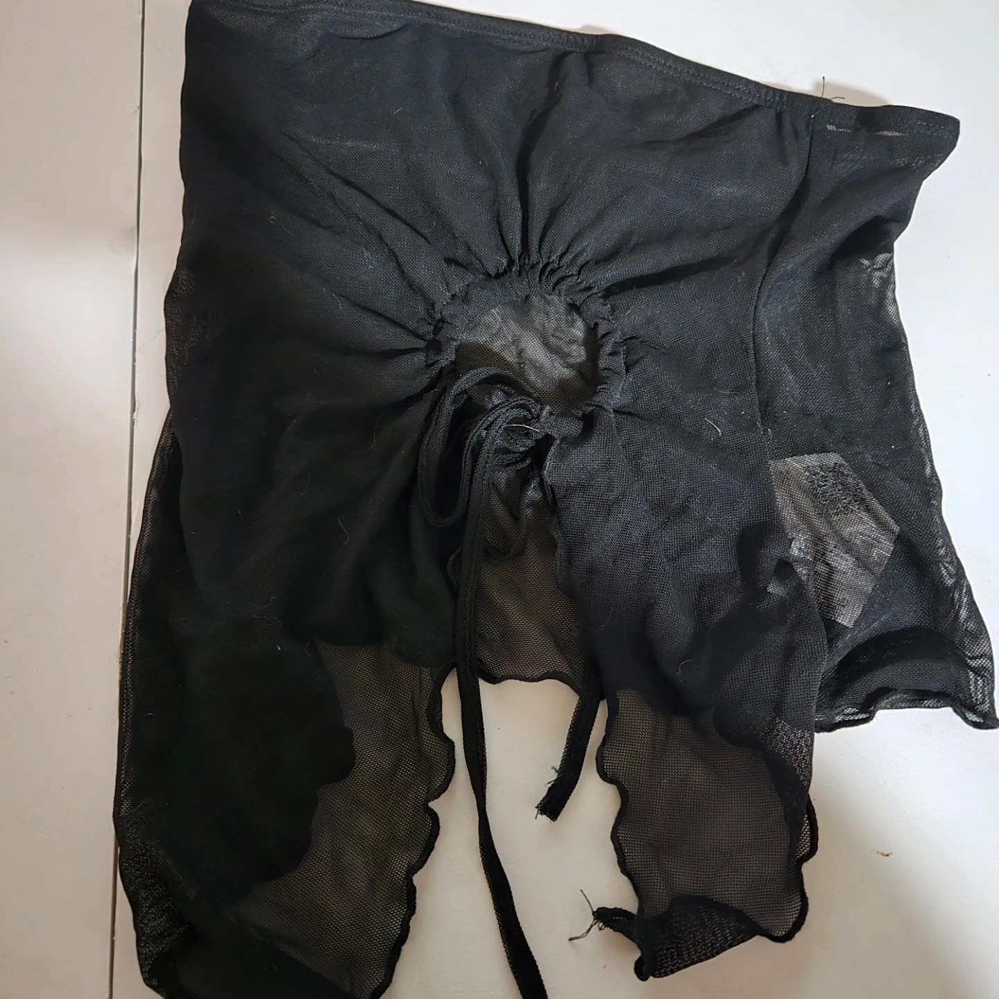 This is a black mesh skirt from SHEIN. It features a ruched front with a drawstring closure and a lettuce hem. The material is sheer mesh.