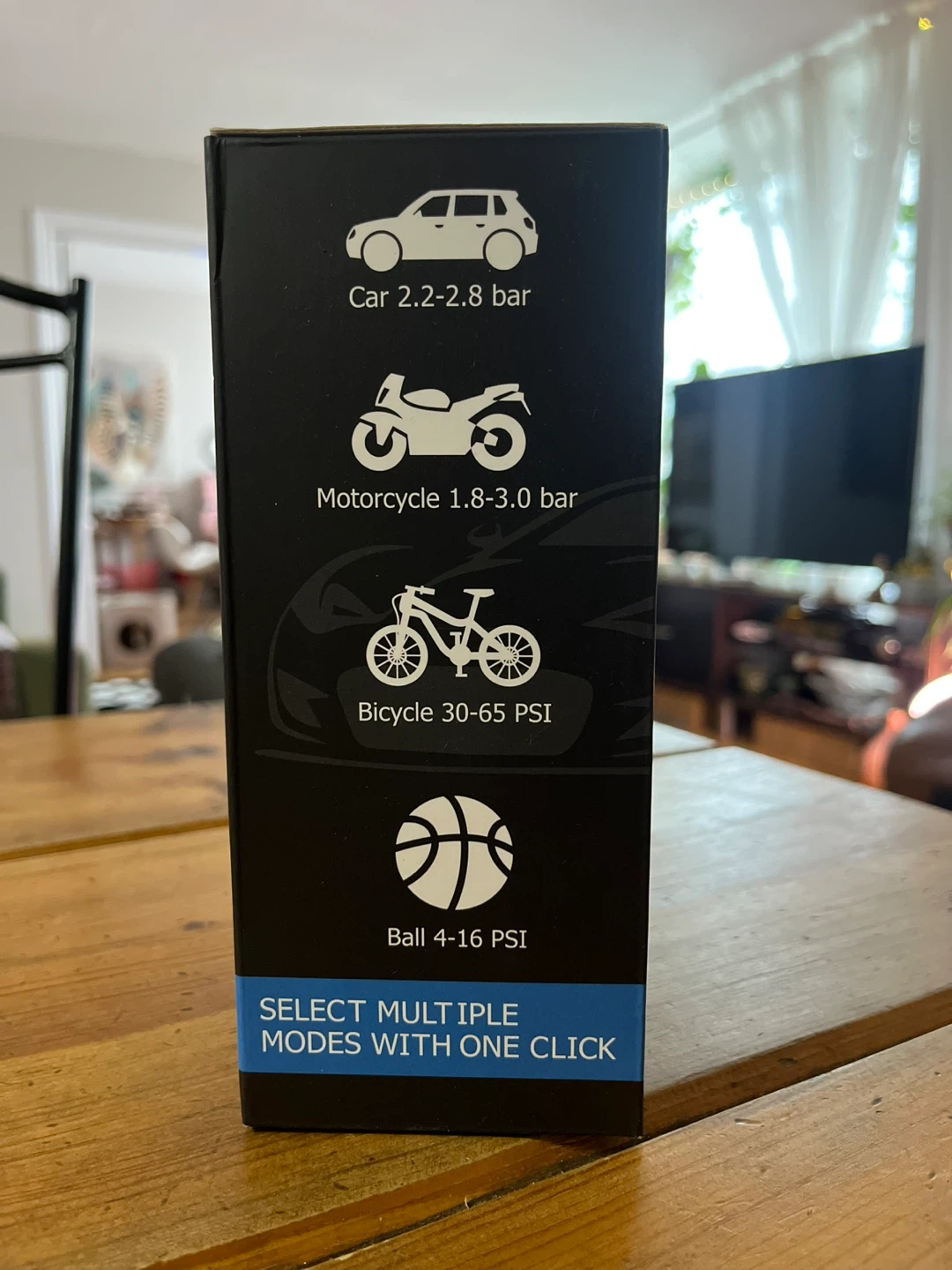 It features preset inflation modes for different uses (car, motorcycle, bike, ball, and custom), so you can quickly select the right setting.