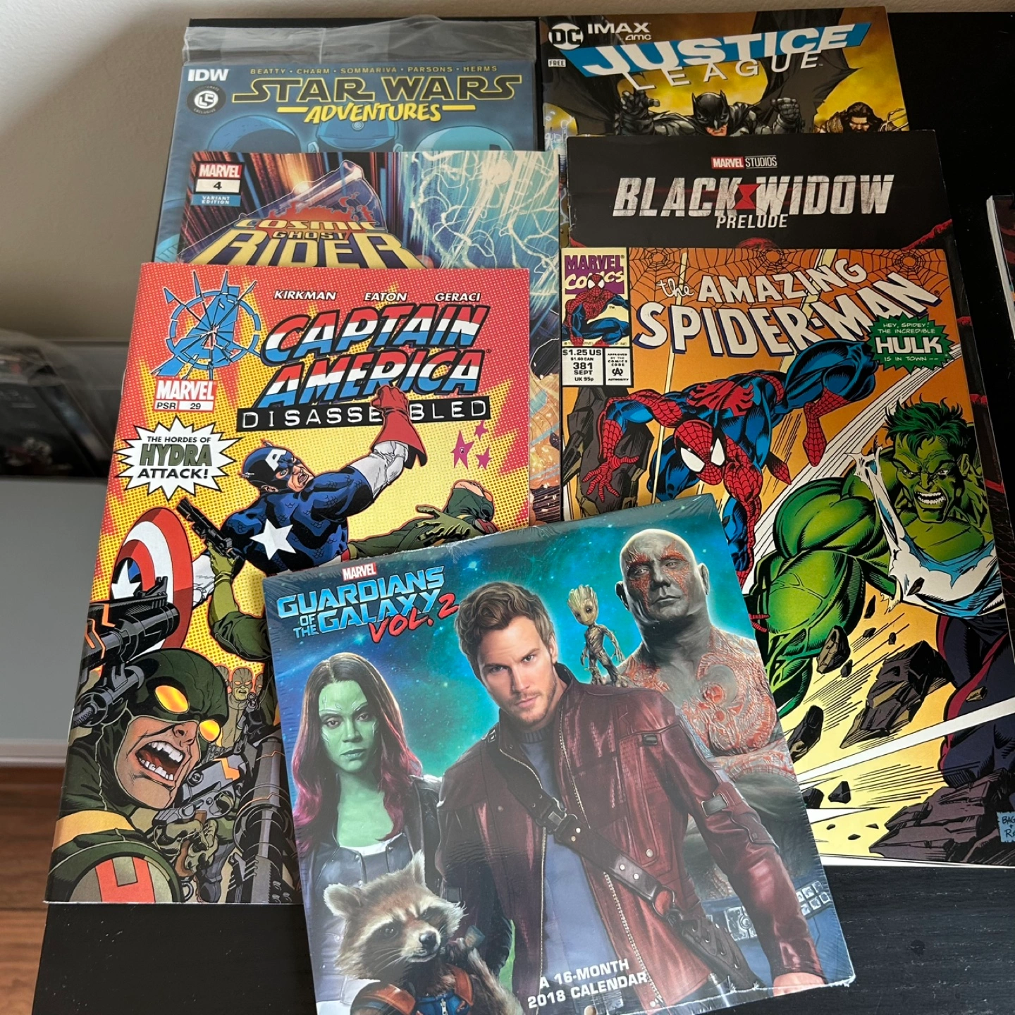 Selling a collection of Marvel comic books. Includes titles like The Amazing Spider-Man, Black Widow Prelude, Captain America Disassembled, and Star Wars Adventures. Also includes a Guardians of the Galaxy Vol. 2 16-month 2018 calendar