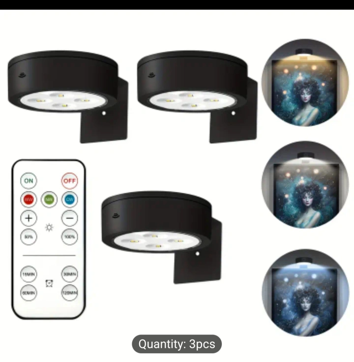 Selling a set of 5 black wall-mounted picture lights. These lights are perfect for highlighting your favorite artwork or photos! They come with a remote control for easy operation. The remote includes settings for on/off, brightness adjustment, and timer settings. Get ready to showcase your pictures in the best light! i have gold and black.