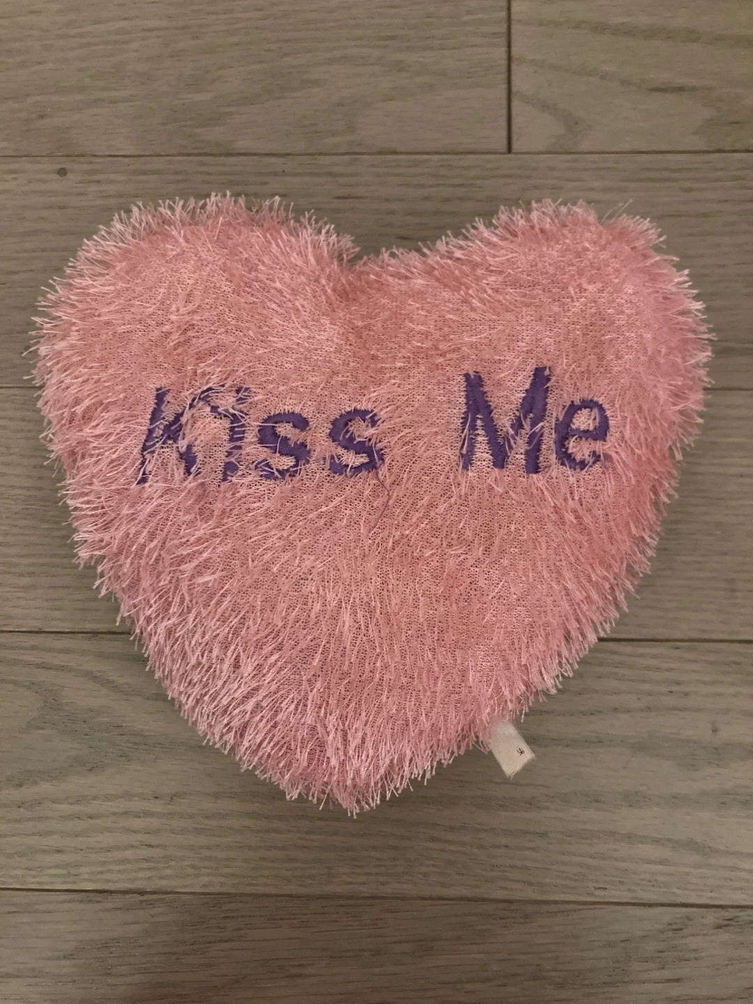 A cute, fuzzy pink heart-shaped pillow! It has the words "Kiss Me" embroidered on the front. It's in great condition and ready to add a touch of love to any space