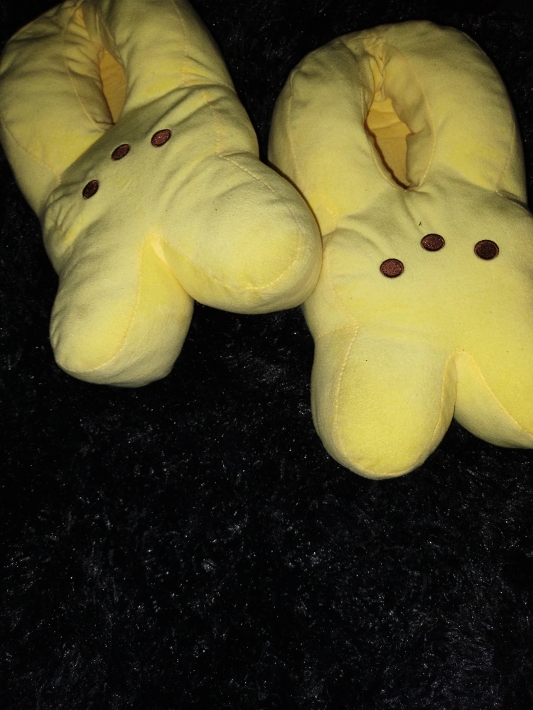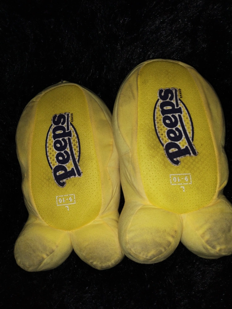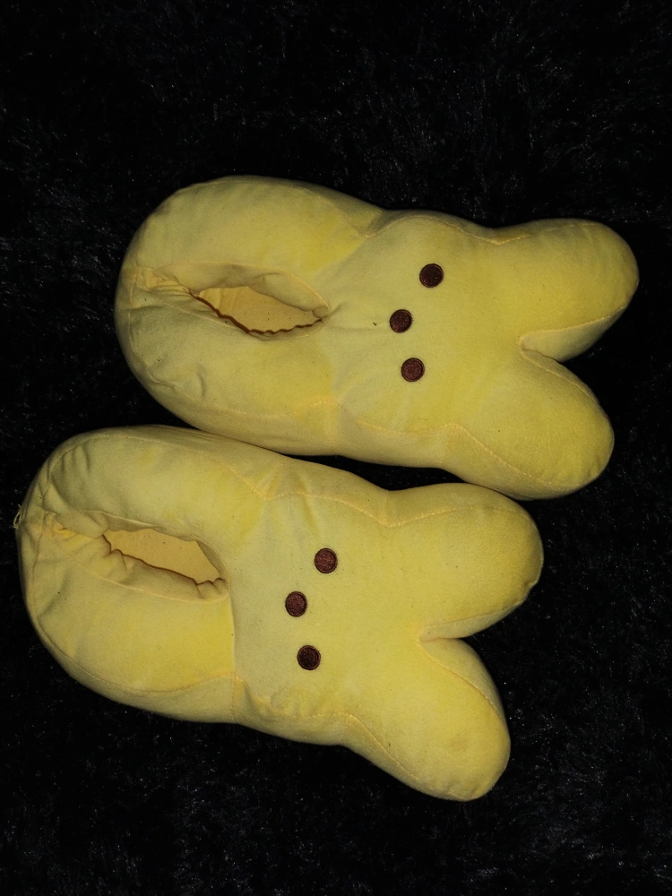 73Selling a pair of Peeps bunny slippers! They are yellow and in size L, which fits sizes 9-10. These fun slippers are perfect for lounging around the house and showing off your love for Peeps!