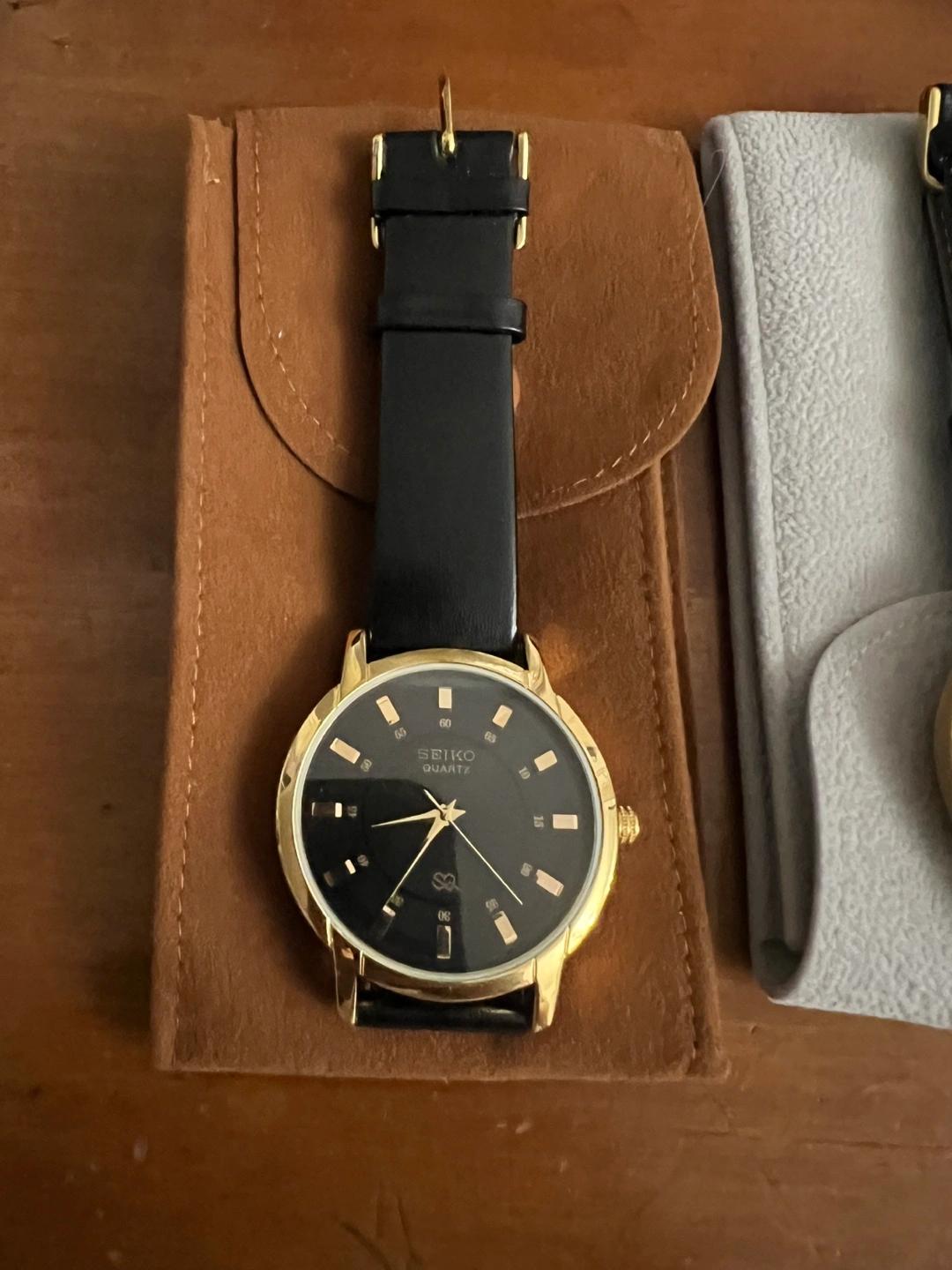 Selling a Seiko Quartz watch with a black face and gold accents. It comes with small watch bag A stylish timepiece for any occasion!