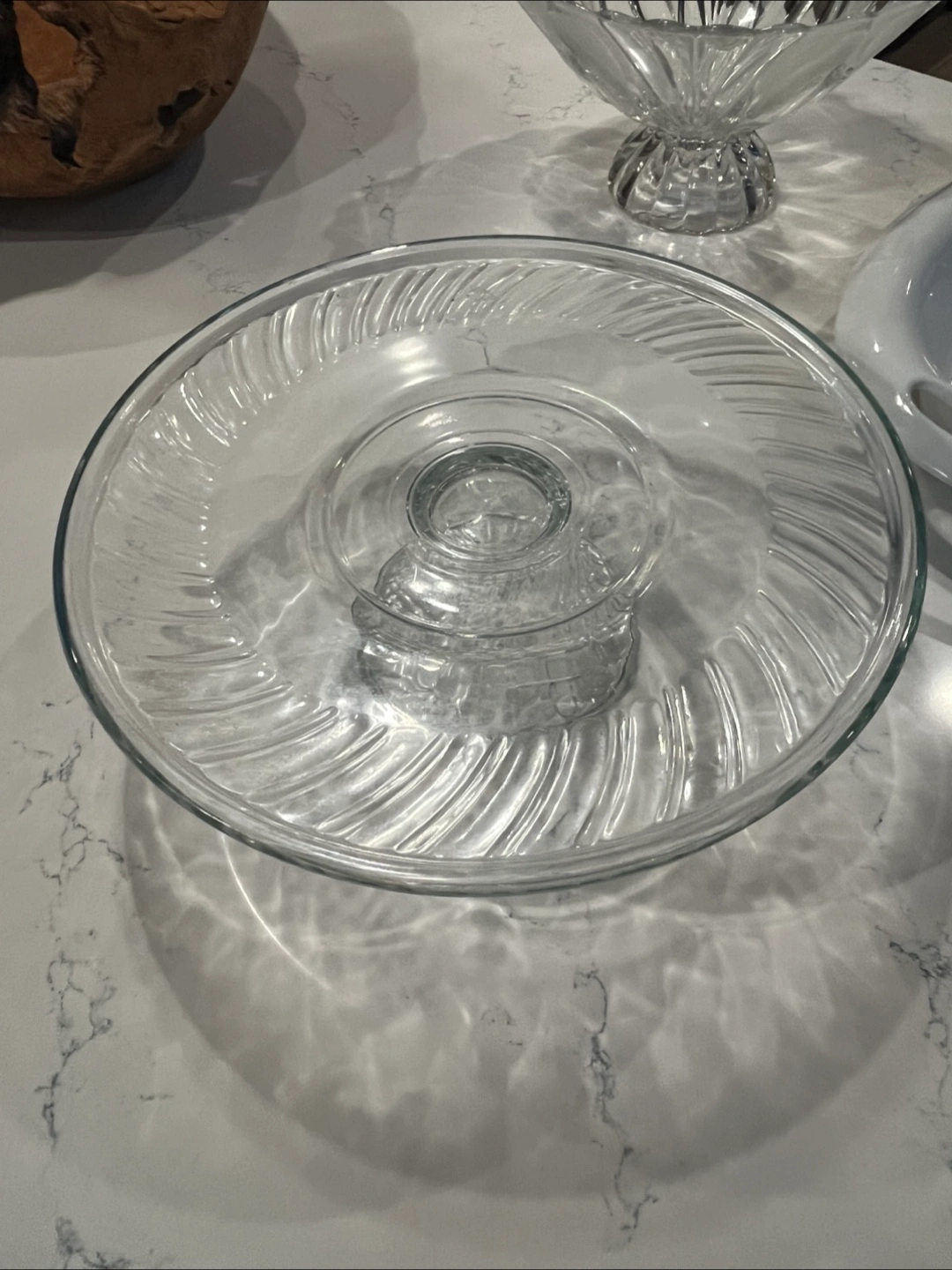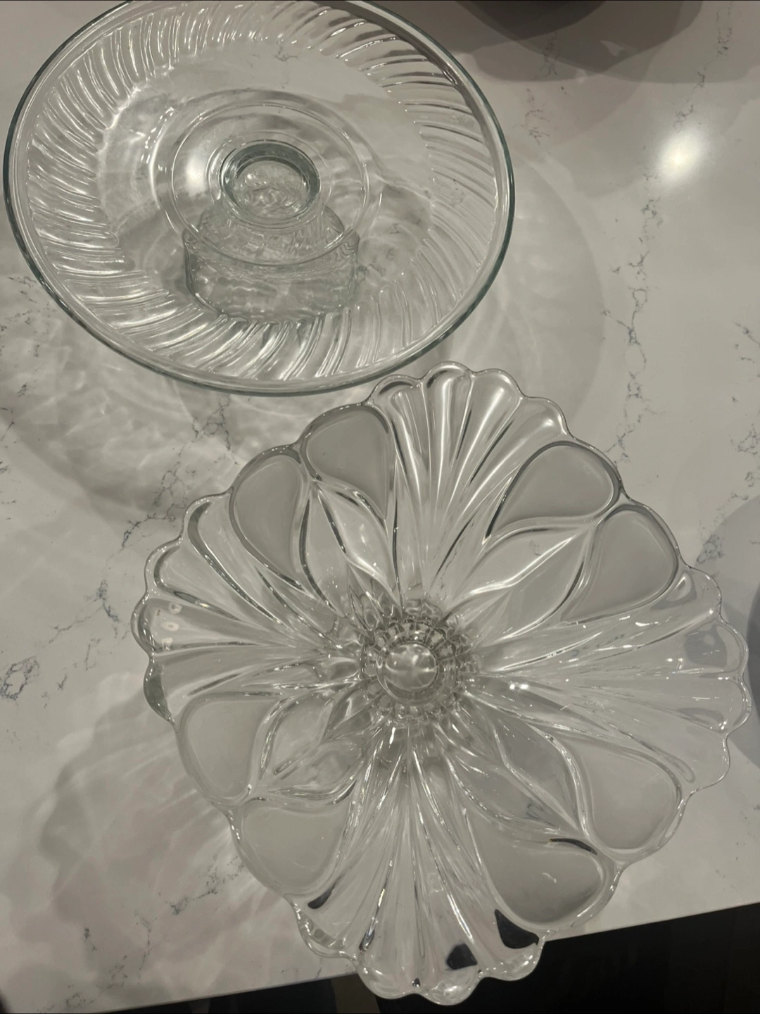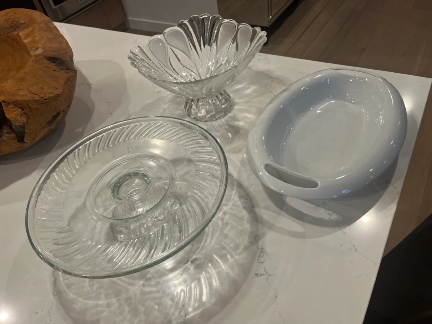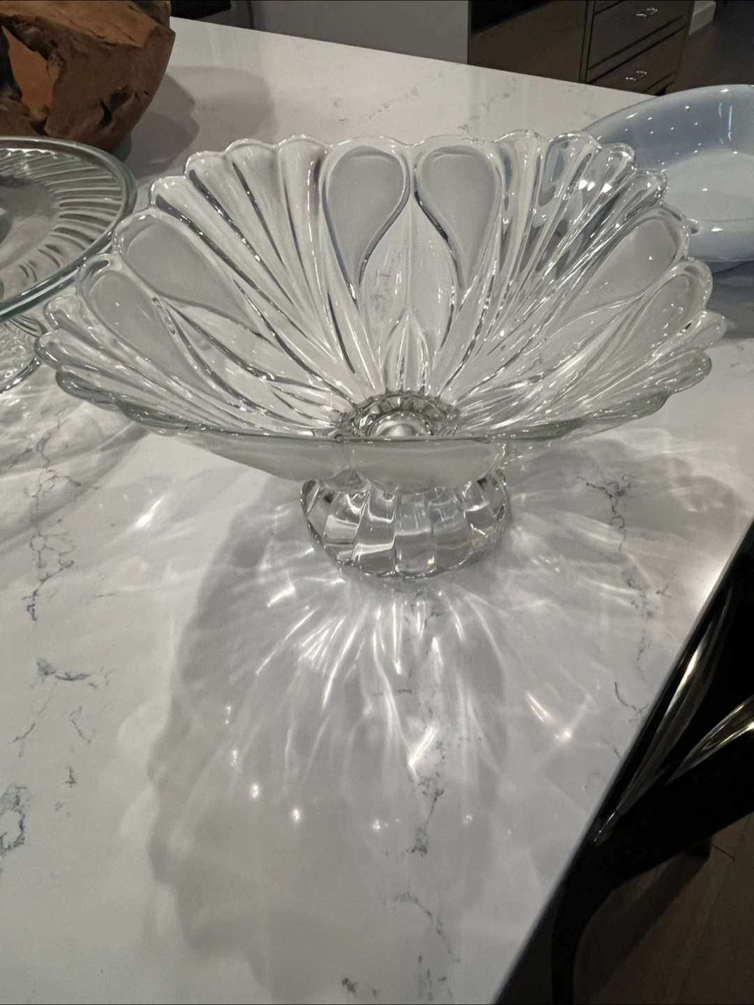 Selling a collection of serving dishes! There's a beautiful glass pedestal bowl, a clear glass serving plate, and a white ceramic dish with handles. They're all in great condition and ready for your next dinner party or gathering