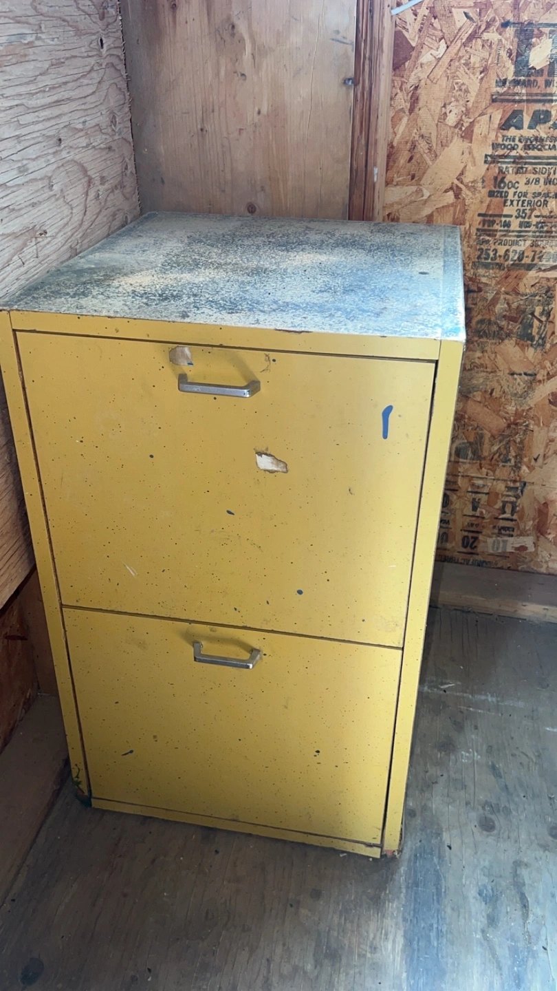 Here's a yellow two-drawer cabinet. It has some wear and tear, as you can see in the photos. Perfect for extra storage in your home office or garage