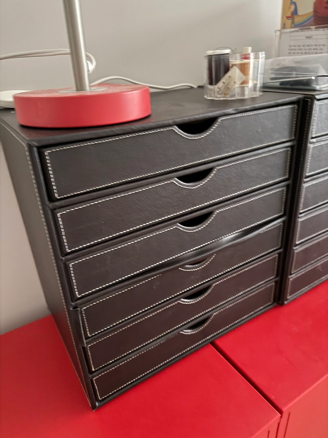 Here's a cute little brown faux leather drawer cabinet! It's in great shape and perfect for storing small items like craft supplies or office essentials