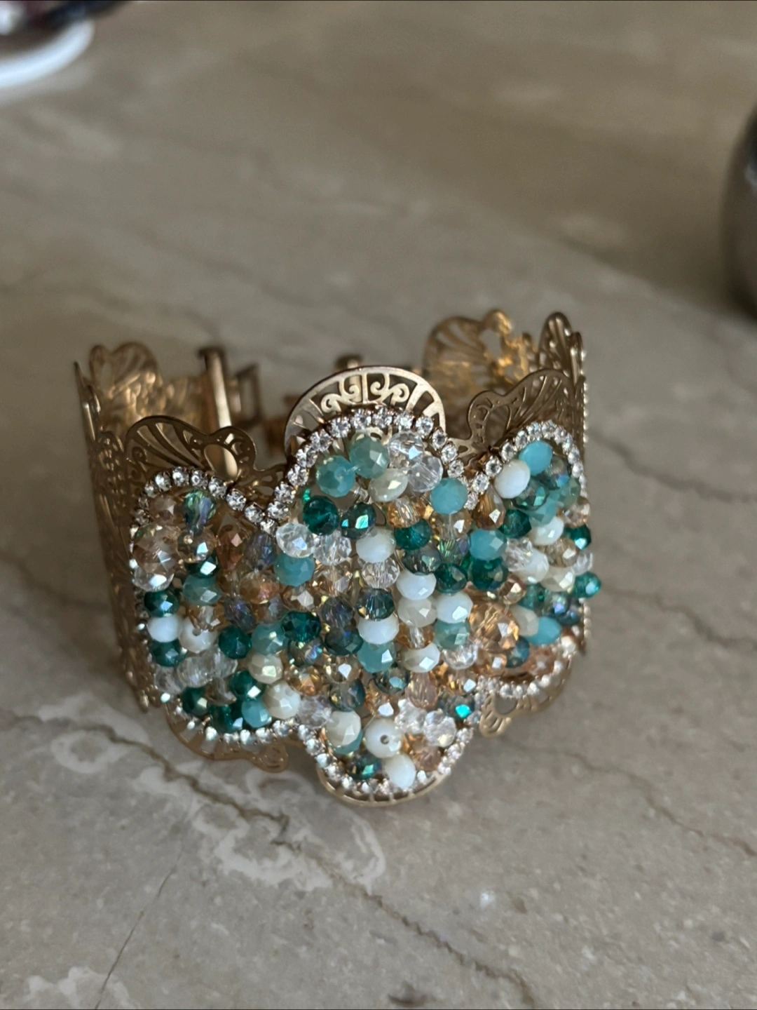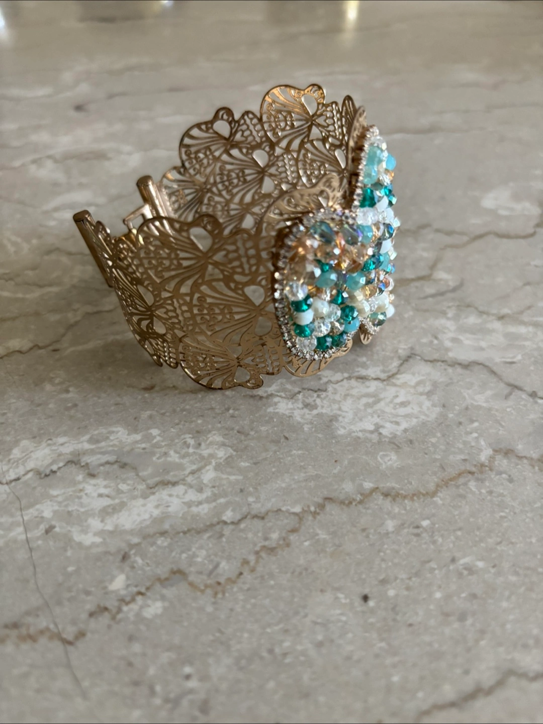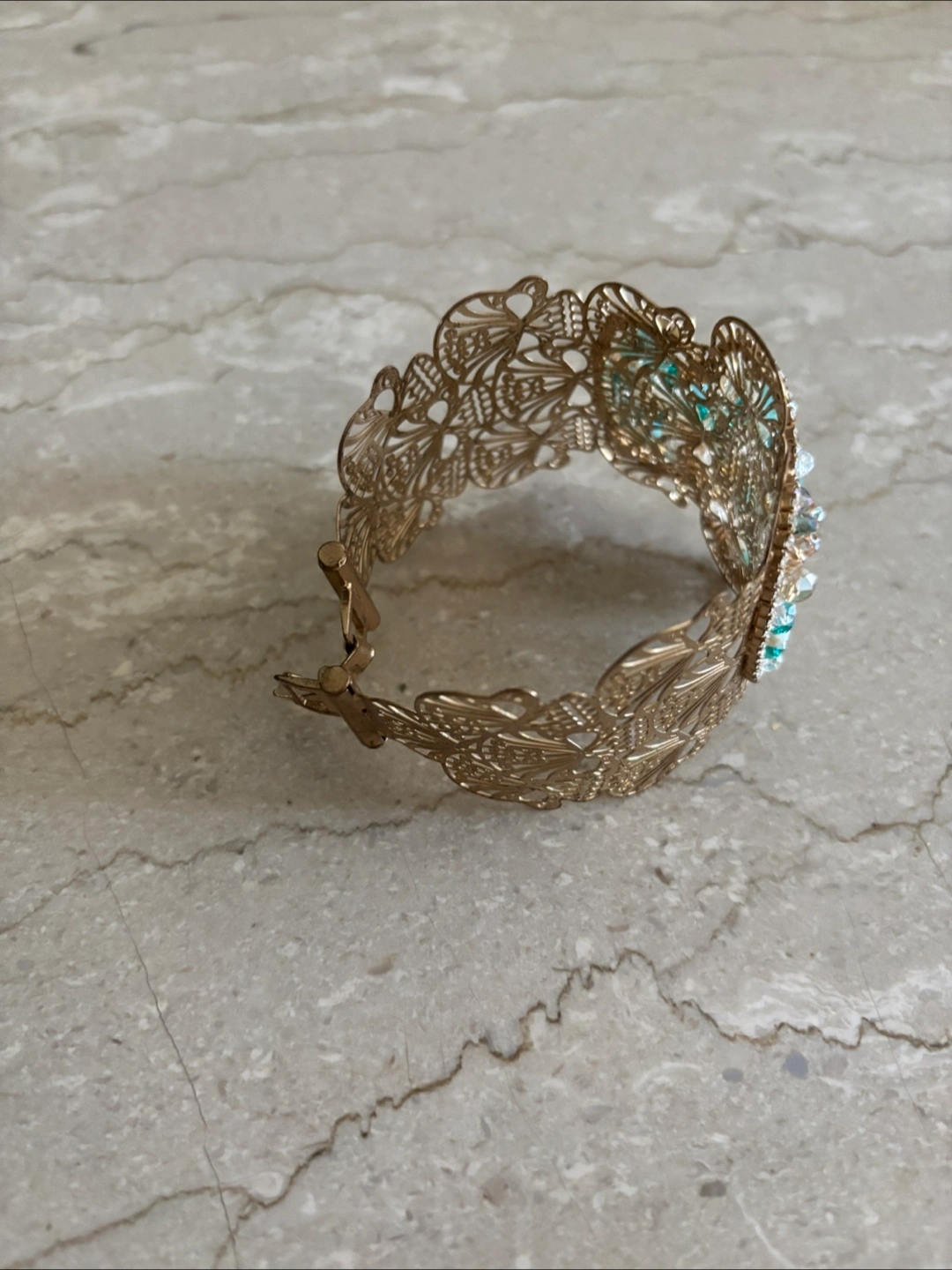Beautiful gold cuff bracelet with intricate filagree detailing and colourful beading. It's in great condition and ready to add a touch of sparkle to your outfit!