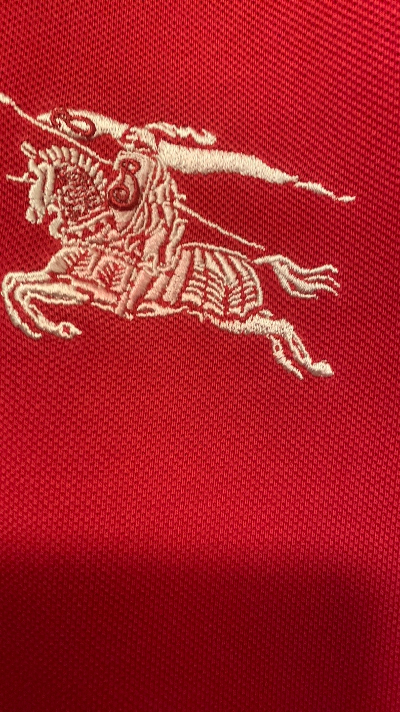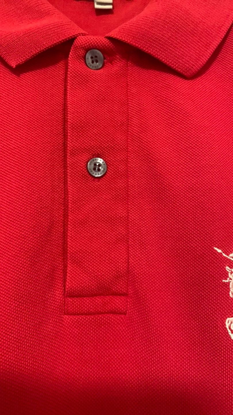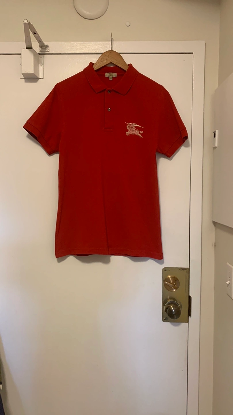 Selling a Burberry London polo shirt in a vibrant red colour! It's a slim fit and size medium. The shirt features the iconic Burberry logo. It's made of 100% cotton, so it's super comfy! Don't miss out!