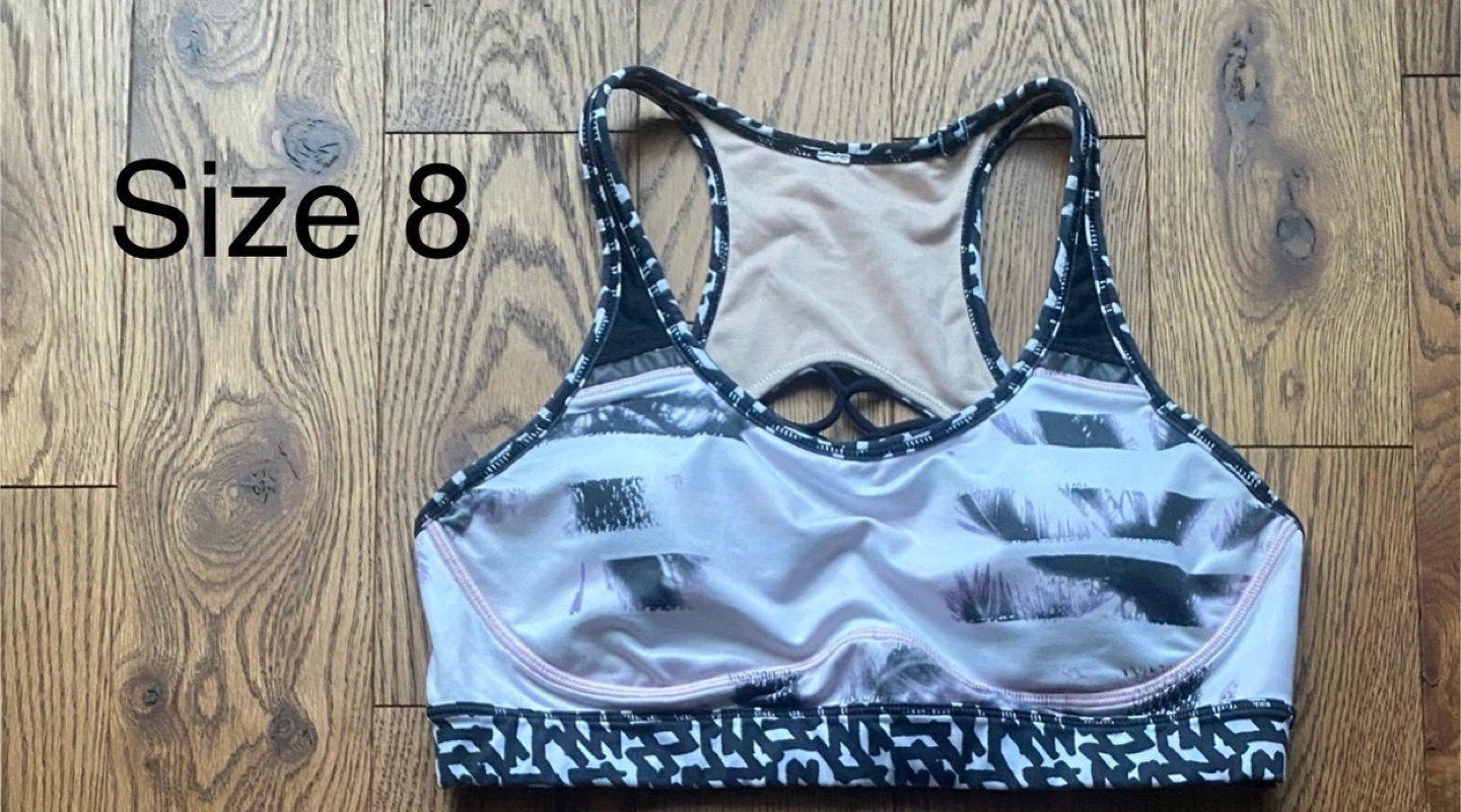 Selling a sports bra in size 8! It features a black and white pattern on the bottom and straps, with a light pink trim. The inner lining is a neutral colour and has a Strappy keyhole design on the back. Perfect for your next workout!