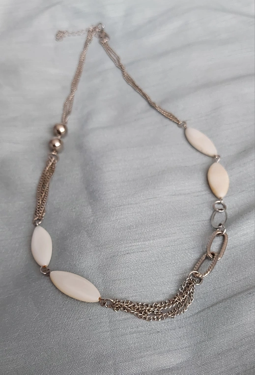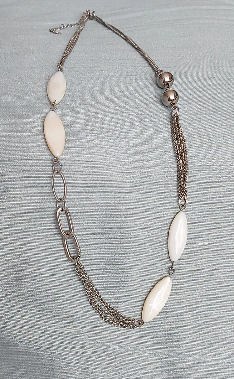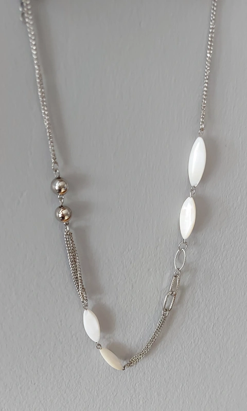 A lovely silver-tone necklace featuring white oval beads and silver spheres. It's in great condition and ready to add a touch of elegance to any outfit