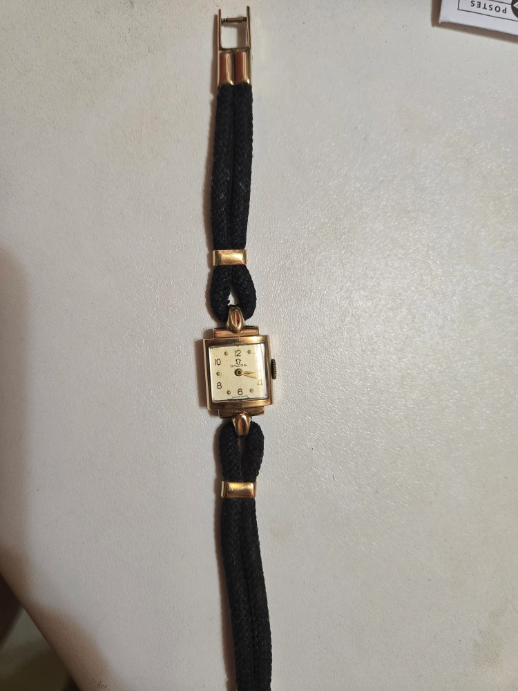 Selling a lovely Omega ladies watch. The watch face is gold with a black band. It's a beautiful vintage piece!