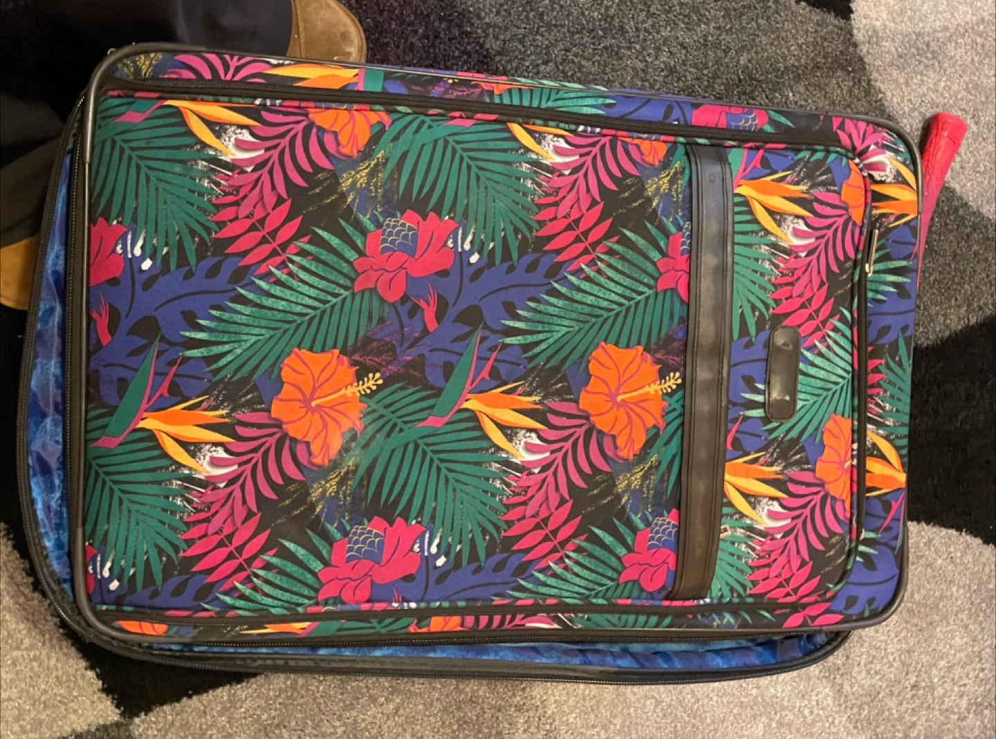 Ricardo Beverly Hills floral patterned rolling suitcase in great condition! It's perfect for your next vacation or weekend getaway. The interior is a beautiful blue colour.