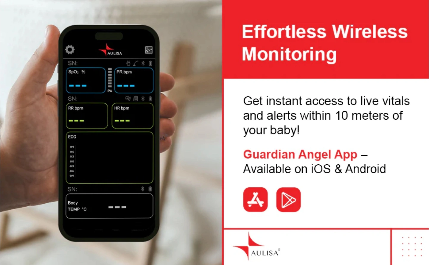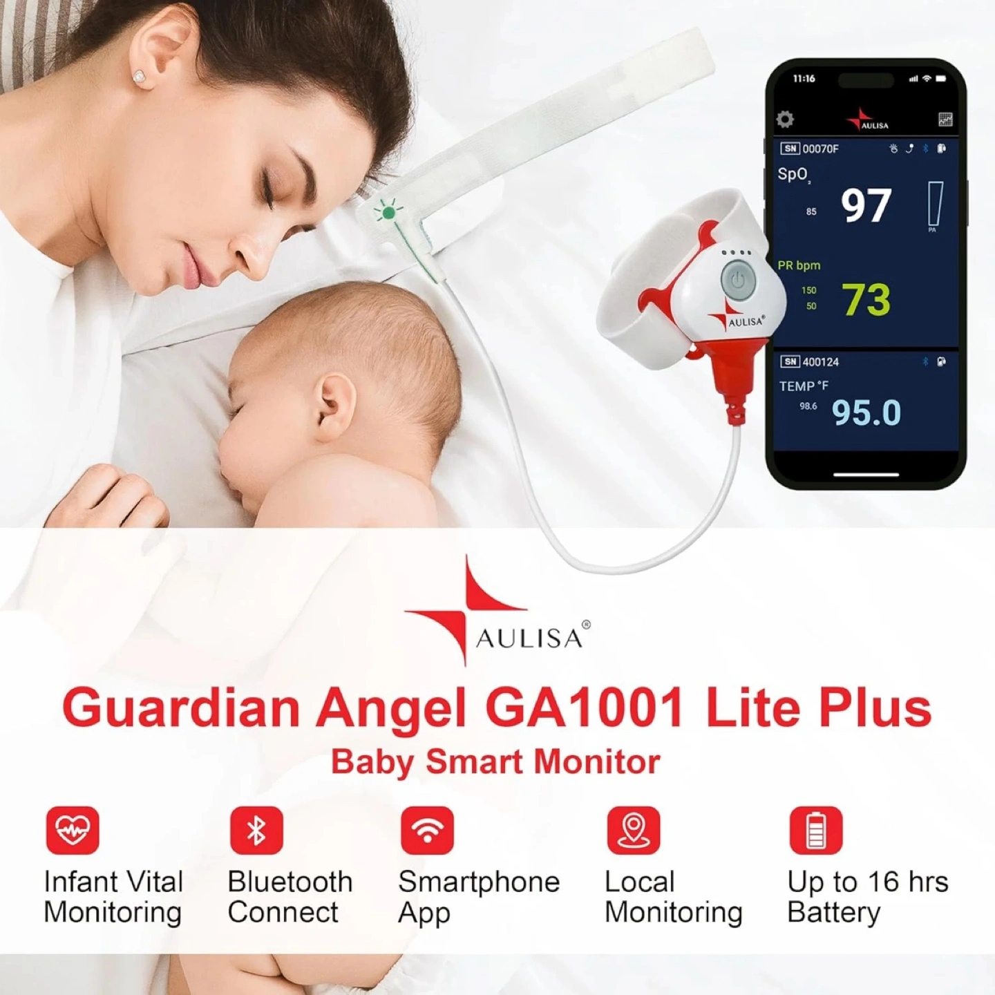 500Brand new in box. Model GA1001 Easy set-up and securely attaches to baby's foot Continuously monitors key vital signs (blood oxygen saturation & heart rate) once per second Using the Guardian Angel® app, locally monitor your baby’s vitals using your smartphone Detects out of range vital signs via audible alarms Customizable alarm settings Aulisa Lite GA1000 app available for download in iOS and Android app stores. Smart Phone must be kept within 10 meters (32.8 feet) of the sensor for proper connectivity through Bluetooth.