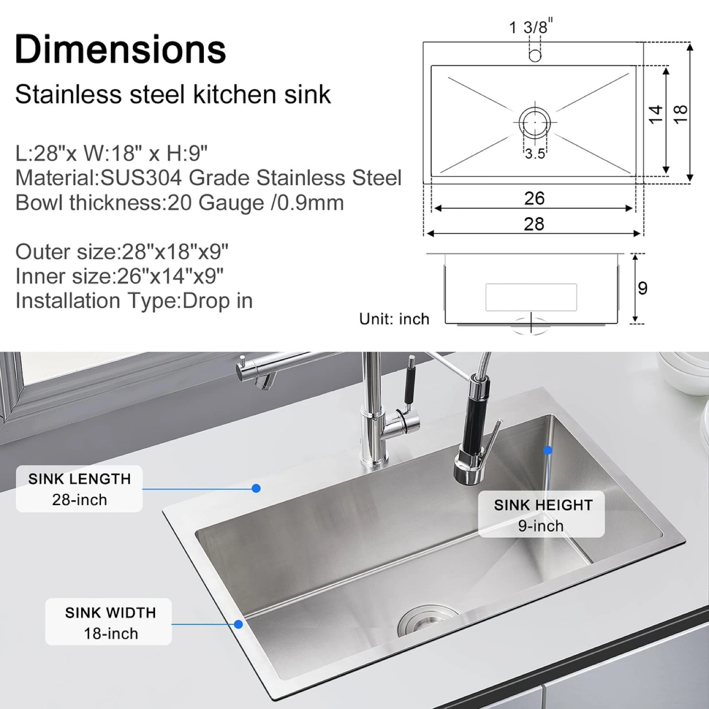 【Dimensions】9" deep stainless steel kitchen and bar prep sink. Fry pan for quick draining and drying, with sloped bottom channel. Exterior dimensions: 28" (width) x 18" (front to back). Interior dimensions: 26" (width) x 14" (front to back) x 9" (bowl depth) | Minimum cabinet size: 30"