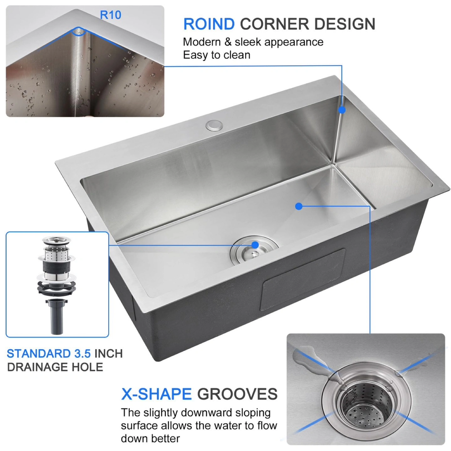 【Handmade Drop-in Kitchen Sink】The bottom is slightly sloped to prevent water from remaining in the bowl. The x-shaped slot makes draining easy and the 9 cm rear drain pipe fits most kitchen appliances, most common garbage disposal systems and frees up extra space.