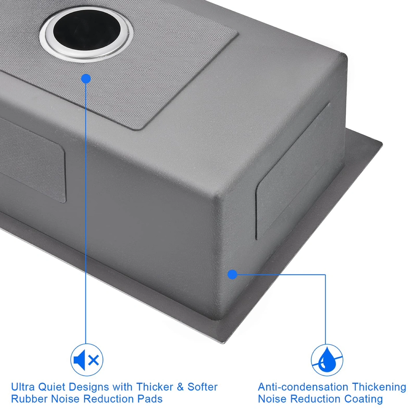 【Unique Design】Single bowl sink features an ultra-quiet design, with thicker and softer rubber noise reduction pads. The thick anti-condensation noise reduction liner absorbs sound at the source and isolates condensation water