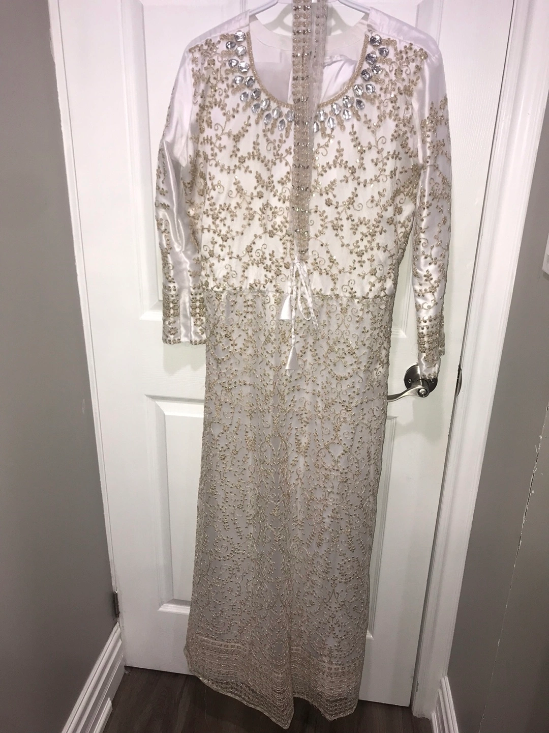 Beautiful white dress with gold embellishments comes with a pants and scarf , perfect for a special occasion! The dress features intricate detailing and a flattering silhouette. It's in great condition and ready for a new home