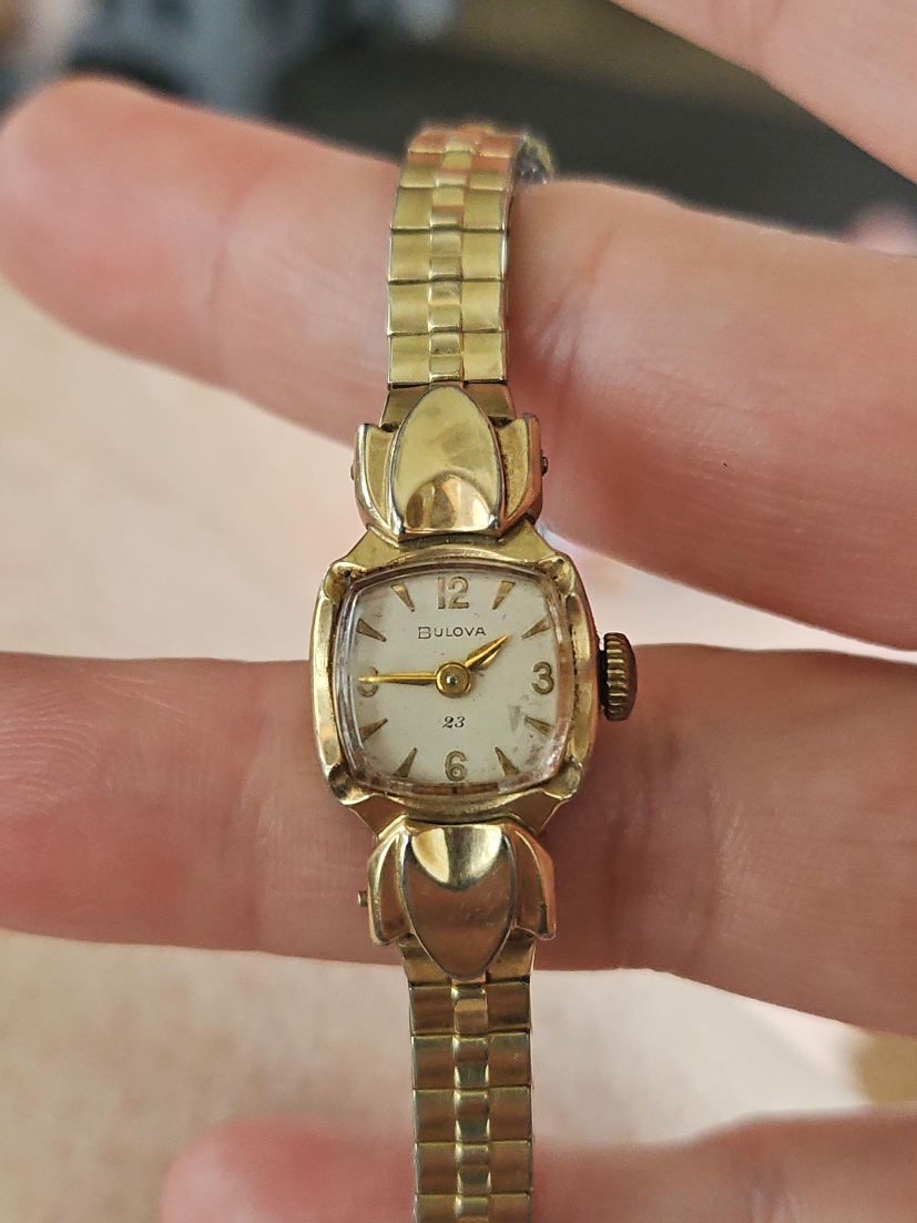 Selling a vintage 1950's Bulova ladies watch. It's a beautiful gold colour and has 23 jewels. There is a model number M76595 on the back. Perfect for a collector or someone who loves vintage pieces!